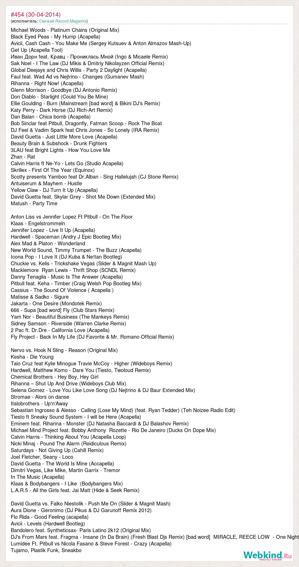 Michael Woods - Platinum Chains (Original Mix) Black Eyed Peas - My Hump (Acapella) Avicii, Cash Cash - You Make Me (Sergey Kutsuev & Anton Almazov Mash-Up) Get Up (Acapella Tool) Иван Дорн feat. Кравц - Прониклась Мной (Ingo & Micaele Remix) Sak Noel - I The Law (DJ Mikis & Dmitriy Nikolayzen Official Remix) Global Deejays and Chris Willis - Party 2 Daylight (Acapella) Faul feat. Wad Ad vs Nejtrino - Changes (Gumanev Mash) Rihanna - Right Now! (Acapella) Glenn Morrison - Goodbye (DJ Antonio Remix) Don Diablo - Starlight (Could You Be Mine) Ellie Goulding - Burn (Mainstream [bad word] & Bikini DJ's Remix) Katy Perry - Dark Horse (DJ Rich-Art Remix) Dan Balan - Chica bomb (Acapella) Bob Sinclar feat Pitbull, Dragonfly, Fatman Scoop - Rock The Boat DJ Feel & Vadim Spark feat Chris Jones - So Lonely (IRA Remix) David Guetta - Just Little More Love (Acapella) Beauty Brain & Subshock - Drunk Fighters 3LAU feat Bright Lights - How You Love Me Zhan - Rat Calvin Harris ft Ne-Yo - Lets Go (Studio Acapella) Skrillex - First Of The Year (Equinox) Scotty presents Yamboo feat Dr.Alban - Sing Hallelujah (CJ Stone Remix) Antuiserum & Mayhem - Hustle Yellow Claw - DJ Turn It Up (Acapella) David Guetta feat. Skylar Grey - Shot Me Down (Extended Mix) Matush - Party Time Anton Liss vs Jennifer Lopez Ft Pitbull - On The Floor Klaas - Engelstrommeln Jennifer Lopez - Live It Up (Acapella) Hardwell - Spaceman (Andry J Epic Bootleg Mix) Alex Mad & Platon - Wonderland New World Sound, Timmy Trumpet - The Buzz (Acapella) Icona Pop - I Love It (DJ Kuba & Ne!tan Bootleg) Chuckie vs. Kelis - Trickshake Vegas (Slider & Magnit Mash Up) Macklemore Ryan Lewis - Thrift Shop (SCNDL Remix) Danny Tenaglia - Music Is The Answer (Acapella) Pitbull feat. Keha - Timber (Craig Welsh Pop Bootleg Mix) Cassius - The Sound Of Violence ( Acapella ) Matisse & Sadko - Sigure Jakarta - One Desire (Mondotek Remix) 666 - Supa [bad word] Fly (Club Stars Remix) Yam Nor - Beautiful Business (The Mankeys Remix) Sidney Samson - Riverside (Warren Clarke Remix) 2 Pac ft. Dr.Dre - California Love (Acapella) Fly Project - Back In My Life (DJ Favorite & Mr. Romano Official Remix) Nervo vs. Hook N Sling - Reason (Original Mix) Kesha - Die Young Taio Cruz feat Kylie Minogue Travie McCoy - Higher (Wideboys Remix) Hardwell, Matthew Komo - Dare You (Tiesto, Twoloud Remix) Chemical Brothers - Hey Boy, Hey Girl Rihanna – Shut Up And Drive (Wideboys Club Mix) Selena Gomez - Love You Like Love Song (DJ Nejtrino & DJ Baur Extended Mix) Stromae - Alors on danse Italobrothers - Up'n'Away Sebastian Ingrosso & Alesso - Calling (Lose My Mind) (feat. Ryan Tedder) (Teh Noizee Radio Edit) Tiesto ft Sneaky Sound System - I will be Here (Acapella) Eminem feat. Rihanna - Monster (DJ Natasha Baccardi & DJ Balashov Remix) Michael Mind Project feat. Bobby Anthony Rozette - Rio De Janeiro (Ducks On Dope Mix) Calvin Harris - Thinking About You (Acapella Loop) Nicki Minaj - Pound The Alarm (Reidiculous Remix) Saturdays - Not Giving Up (Cahill Remix) Joel Fletcher, Seany - Loco David Guetta - The World Is Mine (Accapella) Dimitri Vegas, Like Mike, Martin Garrix - Tremor In The Music (Acapella) Klaas & Bodybangers - I Like (Bodybangers Mix) L.A.R.5 - All the Girls feat. Jai Matt (Hide & Seek Remix) David Guetta vs. Falko Niestolik - Push Me On (Slider & Magnit Mash) Aura Dione - Geronimo (DJ Pikus & DJ Garunoff Remix 2012) Flo Rida - Good Feeling (acapella) Avicii - Levels (Hardwell Bootleg) Bandolero feat. Syntheticsax- Paris Latino 2k12 (Original Mix) DJ's From Mars feat. Fragma - Insane (In Da Brain) (Fresh Blast Djs Remix) [bad word] MIRACLE, REECE LOW - One Night Lumidee Ft. Pitbull vs Nicola Fasano & Steve Forest - Crazy (Acapella) Tujamo, Plastik Funk, Sneakbo