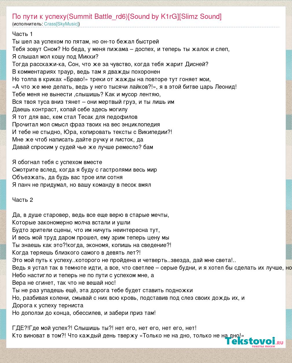 Часть 1 Ты шел за успехом по пятам, но он-то бежал быстрей Тебя зовут Сном? Но беда, у меня пижама – доспех, и теперь ты жалок и слеп, Я слышал мол кошу под Микки? Тогда расскажи-ка, Сон, что же за чувство, когда тебя жарит Дисней? В комментариях траур, ведь там я дважды похоронен Но толпа в криках «Браво!» треки от жажды на повторе тут гоняет мои, «А что же мне делать, ведь у него тысячи лайков?!», я в этой битве царь Леонид! Тебе меня не вынести ,слышишь? Как и мусор лентяю, Вся твоя туса вниз тянет – они мертвый груз, и ты лишь им Даешь контраст, копай себе здесь могилу Я тот для вас, кем стал Тесак для педофилов Прочитал мол смысл фраз твоих на вес энциклопедия И тебе не стыдно, Юра, копировать тексты с Википедии?! Мне же чтоб написать дайте ручку и листок, да Давай спросим у судей чье же лучше ремесло? бам Я обогнал тебя с успехом вместе Смотрите вслед, когда я буду с гастролями весь мир Объезжать, да будь вас трое или сотня Я панч не придумал, но вашу команду в песок вмял Часть 2 Да, в душе старовер, ведь все еще верю в старые мечты, Которые закономерно молча встали и ушли Будто зрители сцены, что им ничуть неинтересна тут, И весь мой труд даром прошел, ему зрим теперь цену мы Ты знаешь как это?!когда, экономя, копишь на сведение?! Когда теряешь близкого самого в девять лет?! Это мой путь к успеху..которого не пройдена и четверть..звезда, дай мне света!.. Ведь я устал так в темноте идти, а все, что светлее – серые будни, и я хотел бы сделать их лучше, но Небо настигло и теперь не по пути с успехом мне, а Вера не сгинет, так что не вешай нос! Ты не раз упадешь ещё, эта дорога тебе будет ставить подножки Но, разбивая колени, смывай с них всю кровь, подставив под слез своих дождь их, и Дорога к успеху терниста Но доползи до конца, обессилев, и забери приз там! ГДЕ?!Где мой успех?! Слышишь ты?! нет его, нет его, нет его, нет! Кто виноват в том?! Что каждый день твержу «Только не на дно, только не на дно!»