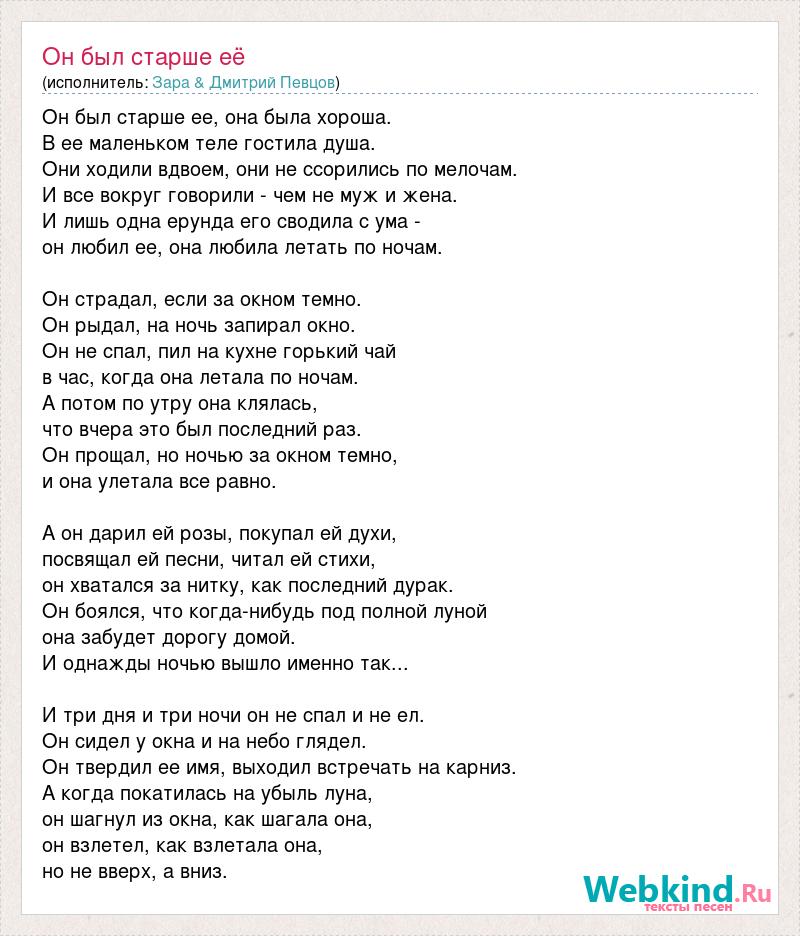 Он был старше ее, она была хороша. В ее маленьком теле гостила душа. Они ходили вдвоем, они не ссорились по мелочам. И все вокруг говорили - чем не муж и жена. И лишь одна ерунда его сводила с ума - он любил ее, она любила летать по ночам. Он страдал, если за окном темно. Он рыдал, на ночь запирал окно. Он не спал, пил на кухне горький чай в час, когда она летала по ночам. А потом по утру она клялась, что вчера это был последний раз. Он прощал, но ночью за окном темно, и она улетала все равно. А он дарил ей розы, покупал ей духи, посвящал ей песни, читал ей стихи, он хватался за нитку, как последний дурак. Он боялся, что когда-нибудь под полной луной она забудет дорогу домой. И однажды ночью вышло именно так... И три дня и три ночи он не спал и не ел. Он сидел у окна и на небо глядел. Он твердил ее имя, выходил встречать на карниз. А когда покатилась на убыль луна, он шагнул из окна, как шагала она, он взлетел, как взлетала она, но не вверх, а вниз.