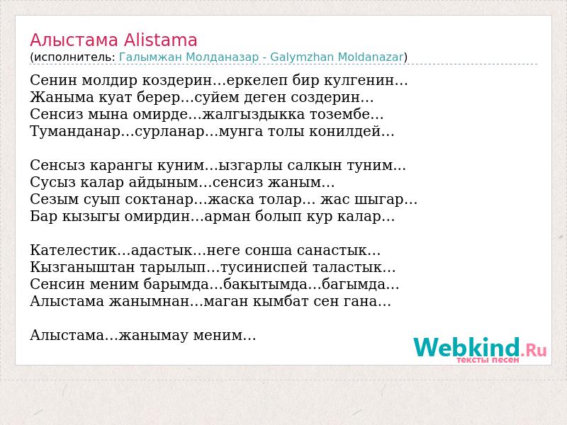 Сенин молдир коздерин…еркелеп бир кулгенин… Жаныма куат берер…суйем деген создерин… Сенсиз мына омирде…жалгыздыкка тозембе… Туманданар…сурланар…мунга толы конилдей… Сенсыз карангы куним…ызгарлы салкын туним... Сусыз калар айдыным…сенсиз жаным… Сезым суып соктанар…жаска толар… жас шыгар… Бар кызыгы омирдин…арман болып кур калар… Кателестик…адастык…неге сонша санастык… Кызганыштан тарылып…тусиниспей таластык… Сенсин меним барымда…бакытымда…багымда… Алыстама жанымнан…маган кымбат сен гана… Алыстама…жанымау меним…