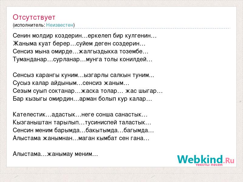 Сенин молдир коздерин…еркелеп бир кулгенин… Жаныма куат берер…суйем деген создерин… Сенсиз мына омирде…жалгыздыкка тозембе… Туманданар…сурланар…мунга толы конилдей… Сенсыз карангы куним…ызгарлы салкын туним... Сусыз калар айдыным…сенсиз жаным… Сезым суып соктанар…жаска толар… жас шыгар… Бар кызыгы омирдин…арман болып кур калар… Кателестик…адастык…неге сонша санастык… Кызганыштан тарылып…тусиниспей таластык… Сенсин меним барымда…бакытымда…багымда… Алыстама жанымнан…маган кымбат сен гана… Алыстама…жанымау меним…