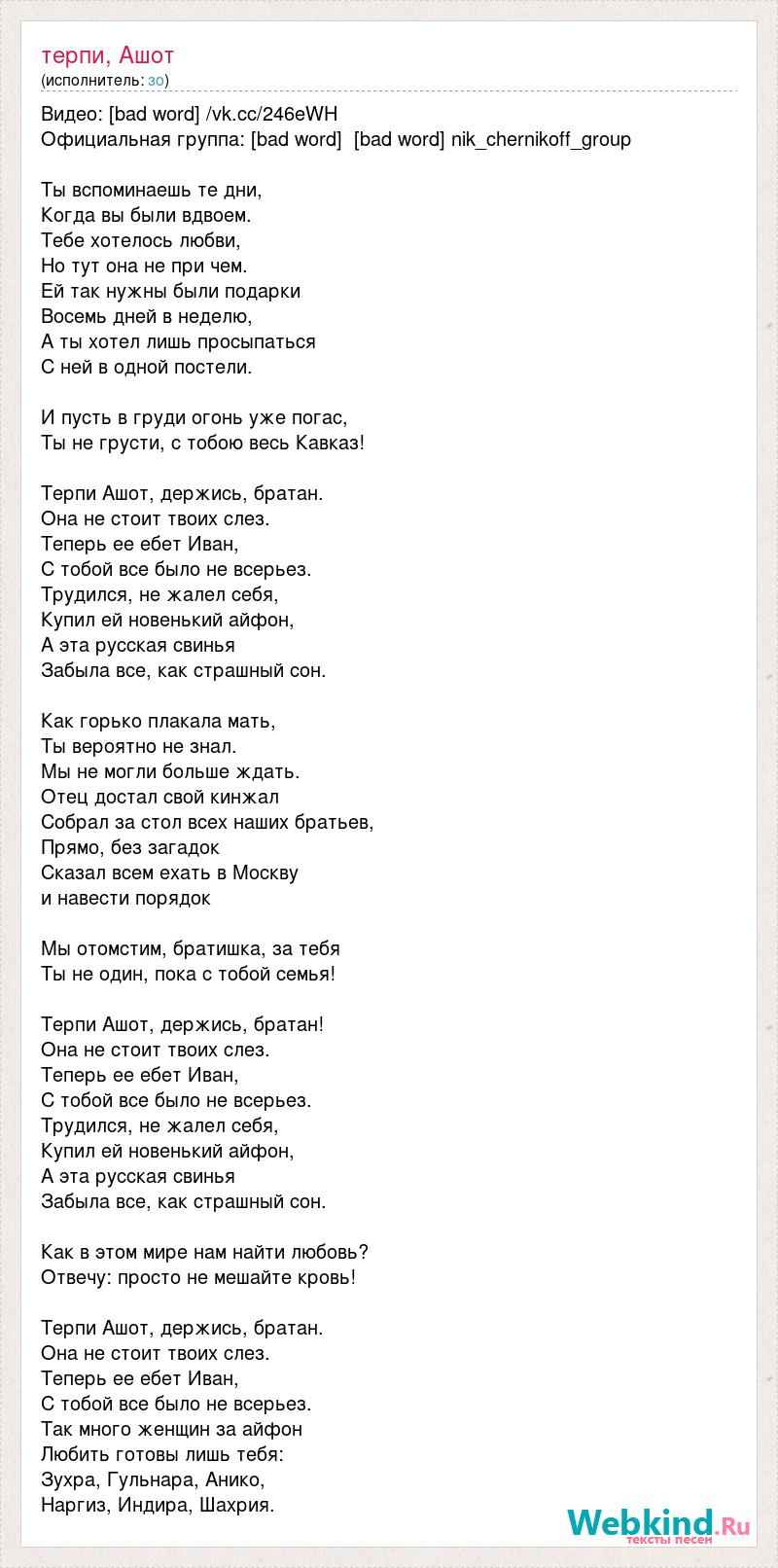 Видео: [bad word] /vk.cc/246eWH Официальная группа: [bad word] [bad word] nik_chernikoff_group Ты вспоминаешь те дни, Когда вы были вдвоем. Тебе хотелось любви, Но тут она не при чем. Ей так нужны были подарки Восемь дней в неделю, А ты хотел лишь просыпаться С ней в одной постели. И пусть в груди огонь уже погас, Ты не грусти, с тобою весь Кавказ! Терпи Ашот, держись, братан. Она не стоит твоих слез. Теперь ее ебет Иван, С тобой все было не всерьез. Трудился, не жалел себя, Купил ей новенький айфон, А эта русская свинья Забыла все, как страшный сон. Как горько плакала мать, Ты вероятно не знал. Мы не могли больше ждать. Отец достал свой кинжал Собрал за стол всех наших братьев, Прямо, без загадок Сказал всем ехать в Москву и навести порядок Мы отомстим, братишка, за тебя Ты не один, пока с тобой семья! Терпи Ашот, держись, братан! Она не стоит твоих слез. Теперь ее ебет Иван, С тобой все было не всерьез. Трудился, не жалел себя, Купил ей новенький айфон, А эта русская свинья Забыла все, как страшный сон. Как в этом мире нам найти любовь? Отвечу: просто не мешайте кровь! Терпи Ашот, держись, братан. Она не стоит твоих слез. Теперь ее ебет Иван, С тобой все было не всерьез. Так много женщин за айфон Любить готовы лишь тебя: Зухра, Гульнара, Анико, Наргиз, Индира, Шахрия.