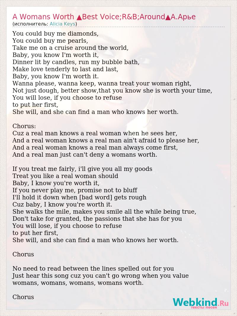 You could buy me diamonds, You could buy me pearls, Take me on a cruise around the world, Baby, you know I'm worth it, Dinner lit by candles, run my bubble bath, Make love tenderly to last and last, Baby, you know I'm worth it. Wanna please, wanna keep, wanna treat your woman right, Not just dough, better show,that you know she is worth your time, You will lose, if you choose to refuse to put her first, She will, and she can find a man who knows her worth. Chorus: Cuz a real man knows a real woman when he sees her, And a real woman knows a real man ain't afraid to please her, And a real woman knows a real man always come first, And a real man just can't deny a womans worth. If you treat me fairly, i'll give you all my goods Treat you like a real woman should Baby, I know you're worth it, If you never play me, promise not to bluff I'll hold it down when [bad word] gets rough Cuz baby, I know you're worth it. She walks the mile, makes you smile all the while being true, Don't take for granted, the passions that she has for you You will lose, if you choose to refuse to put her first, She will, and she can find a man who knows her worth. Chorus No need to read between the lines spelled out for you Just hear this song cuz you can't go wrong when you value womans, womans, womans, womans worth. Chorus