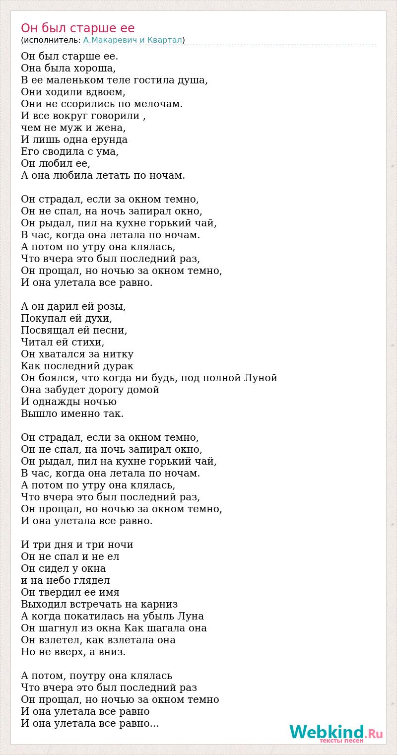 Он был старше ее. Она была хороша, В ее маленьком теле гостила душа, Они ходили вдвоем, Они не ссорились по мелочам. И все вокруг говорили , чем не муж и жена, И лишь одна ерунда Его сводила с ума, Он любил ее, А она любила летать по ночам. Он страдал, если за окном темно, Он не спал, на ночь запирал окно, Он рыдал, пил на кухне горький чай, В час, когда она летала по ночам. А потом по утру она клялась, Что вчера это был последний раз, Он прощал, но ночью за окном темно, И она улетала все равно. А он дарил ей розы, Покупал ей духи, Посвящал ей песни, Читал ей стихи, Он хватался за нитку Как последний дурак Он боялся, что когда ни будь, под полной Луной Она забудет дорогу домой И однажды ночью Вышло именно так. Он страдал, если за окном темно, Он не спал, на ночь запирал окно, Он рыдал, пил на кухне горький чай, В час, когда она летала по ночам. А потом по утру она клялась, Что вчера это был последний раз, Он прощал, но ночью за окном темно, И она улетала все равно. И три дня и три ночи Он не спал и не ел Он сидел у окна и на небо глядел Он твердил ее имя Выходил встречать на карниз А когда покатилась на убыль Луна Он шагнул из окна Как шагала она Он взлетел, как взлетала она Но не вверх, а вниз. А потом, поутру она клялась Что вчера это был последний раз Он прощал, но ночью за окном темно И она улетала все равно И она улетала все равно...