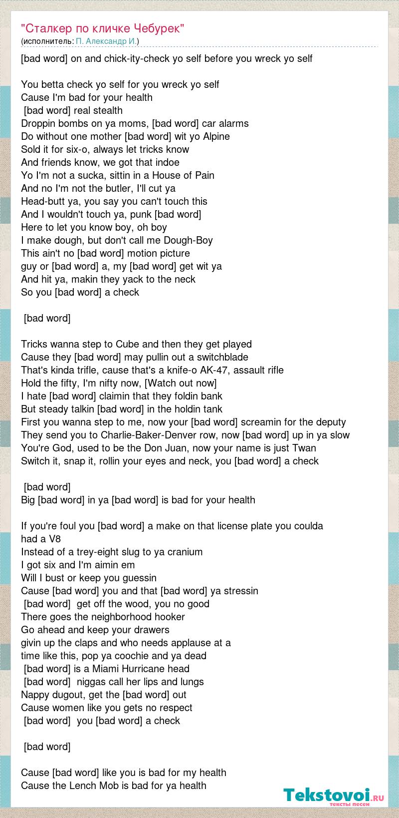So come on and chick-ity-check yo self before you wreck yo self You betta check yo self for you wreck yo self Cause I'm bad for your health I come real stealth Droppin bombs on ya moms, [bad word] car alarms Do without one mother [bad word] wit yo Alpine Sold it for six-o, always let tricks know And friends know, we got that indoe Yo I'm not a sucka, sittin in a House of Pain And no I'm not the butler, I'll cut ya Head-butt ya, you say you can't touch this And I wouldn't touch ya, punk [bad word] Here to let you know boy, oh boy I make dough, but don't call me Dough-Boy This ain't no [bad word] motion picture guy or [bad word] a, my [bad word] get wit ya And hit ya, makin they yack to the neck So you better run a check CHORUS Tricks wanna step to Cube and then they get played Cause they [bad word] may pullin out a switchblade That's kinda trifle, cause that's a knife-o AK-47, assault rifle Hold the fifty, I'm nifty now, [Watch out now] I hate [bad word] claimin that they foldin bank But steady talkin [bad word] in the holdin tank First you wanna step to me, now your [bad word] screamin for the deputy They send you to Charlie-Baker-Denver row, now the runnin up in ya slow You're God, used to be the Don Juan, now your name is just Twan Switch it, snap it, rollin your eyes and neck, you better run a check CHORUS Big [bad word] in ya [bad word] is bad for your health If you're foul you better run a make on that license plate you coulda had a V8 Instead of a trey-eight slug to ya cranium I got six and I'm aimin em Will I bust or keep you guessin Cause [bad word] you and that [bad word] ya stressin [bad word] get off the wood, you no good There goes the neighborhood hooker Go ahead and keep your drawers givin up the claps and who needs applause at a time like this, pop ya coochie and ya dead [bad word] is a Miami Hurricane head Sprung, niggas call her lips and lungs Nappy dugout, get the [bad word] out Cause women like you gets no respect [bad word] you better run a check CHORUS Cause [bad word] like you is bad for my health Cause the Lench Mob is bad for ya health