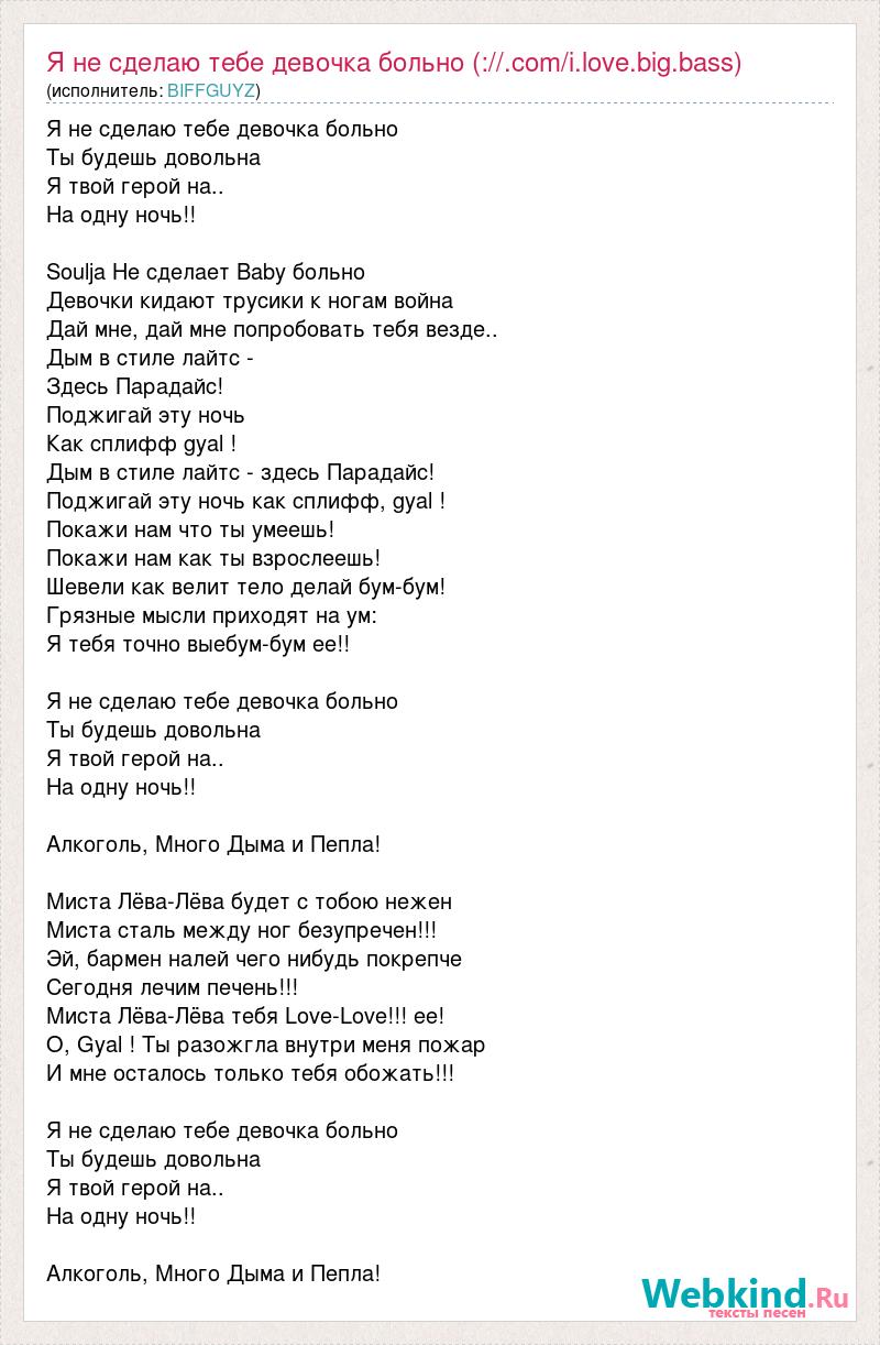 Я не сделаю тебе девочка больно Ты будешь довольна Я твой герой на.. На одну ночь!! Soulja Не сделает Baby больно Девочки кидают трусики к ногам война Дай мне, дай мне попробовать тебя везде.. Дым в стиле лайтс - Здесь Парадайс! Поджигай эту ночь Как сплифф gyal ! Дым в стиле лайтс - здесь Парадайс! Поджигай эту ночь как сплифф, gyal ! Покажи нам что ты умеешь! Покажи нам как ты взрослеешь! Шевели как велит тело делай бум-бум! Грязные мысли приходят на ум: Я тебя точно выебум-бум ее!! Я не сделаю тебе девочка больно Ты будешь довольна Я твой герой на.. На одну ночь!! Алкоголь, Много Дыма и Пепла! Миста Лёва-Лёва будет с тобою нежен Миста сталь между ног безупречен!!! Эй, бармен налей чего нибудь покрепче Сегодня лечим печень!!! Миста Лёва-Лёва тебя Love-Love!!! ее! O, Gyal ! Ты разожгла внутри меня пожар И мне осталось только тебя обожать!!! Я не сделаю тебе девочка больно Ты будешь довольна Я твой герой на.. На одну ночь!! Алкоголь, Много Дыма и Пепла!