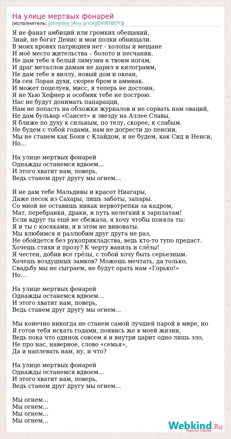Я не фанат амбиций или громких обещаний, Знай, не богат Денис и мои полки обнищали. В моих кровях патрициев нет - холопы и мещане И моё место жительства – болото и песчаник. Не дам тебе я белый лимузин к твоим ногам, И драг металлов дамам не дарил я килограмм, Не дам тебе я виллу, новый дом и океан, Ив сен Лоран духи, скорее бром и аммиак. И может поцелуев, мисс, я теперь не достоин, Я не Хью Хефнер и особняк тебе не построю. Нас не будут донимать папарацци, Нам не попасть на обложки журналов и не сорвать нам оваций, Не дам бульвар «Сансет» и звезду на Аллее Славы, Я ближе по духу к сильным, по телу, скорее, к слабым. Не будем с тобой годами, нам не догрести до пенсии, Мы не станем как Бони с Клайдом, и не будем, как Сид и Ненси, Но… На улице мертвых фонарей Однажды останемся вдвоем… И этого хватит нам, поверь, Ведь станем друг другу мы огнем… Я не дам тебе Мальдивы и красот Ниагары, Даже песок из Сахары, лишь заботы, запары. Со мной не оставишь никак нервотрепки за кадром, Мат, перебранки, драки, и путь нелегкий к зарплатам! Если вдруг ты ещё не сбежала, я хочу чтобы поняла ты: Я и ты с косяками, и в этом не виноваты. Мы влюбимся и разлюбим друг друга не раз, Не обойдется без рукоприкладства, ведь кто-то тупо предаст. Хочешь стихи и прозу? К черту ваниль и слёзы! Я честен, добив все грёзы, с тобой хочу быть серьезным. Хочешь воздушных замков? Можешь мечтать, да только, Свадьбу мы не сыграем, не будут орать нам «Горько!» Но… На улице мертвых фонарей Однажды останемся вдвоем… И этого хватит нам, поверь, Ведь станем друг другу мы огнем… Мы конечно никогда не станем самой лучшей парой в мире, но Я готов тебя искать годами, появись же в моей жизни, Ведь пока что одинок совсем я и внутри царит одно лишь зло, Не про нас, наверное, слово «семья», Да и наплевать нам, ну, и что? На улице мертвых фонарей Однажды останемся вдвоем… И этого хватит нам, поверь, Ведь станем друг другу мы огнем… Мы огнем… Мы огнем… Мы огнем… Мы огнем…