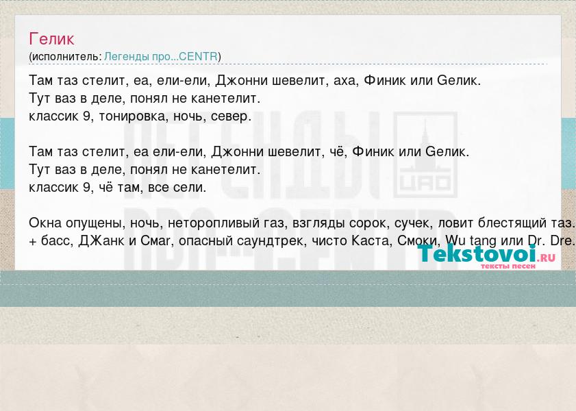 Там таз стелит, еа, ели-ели, Джонни шевелит, аха, Финик или Gелик. Тут ваз в деле, понял не канетелит. классик 9, тонировка, ночь, север. Там таз стелит, еа ели-ели, Джонни шевелит, чё, Финик или Gелик. Тут ваз в деле, понял не канетелит. классик 9, чё там, все сели. Окна опущены, ночь, неторопливый газ, взгляды сорок, сучек, ловит блестящий таз. + басс, ДЖанк и Смаr, опасный саундтрек, чисто Каста, Смоки, Wu tang или Dr. Dre.
