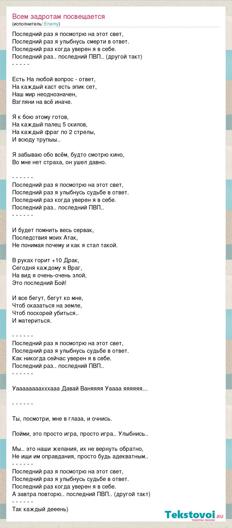 Последний раз я посмотрю на этот свет, Последний раз я улыбнусь смерти в ответ. Последний раз когда уверен я в себе. Последний раз.. последний ПВП.. (другой такт) - - - - - Есть На любой вопрос - ответ, На каждый каст есть эпик сет, Наш мир неоднозначен, Взгляни на всё иначе. Я к бою этому готов, На каждый палец 5 скилов, На каждый фраг по 2 стрелы, И всюду трупыы.. Я забываю обо всём, будто смотрю кино, Во мне нет страха, он ушел давно. - - - - - - Последний раз я посмотрю на этот свет, Последний раз я улыбнусь судьбе в ответ. Последний раз когда уверен я в себе. Последний раз.. последний ПВП.. - - - - - - И будет помнить весь сервак, Последствия моих Атак, Не понимая почему и как я стал такой. В руках горит +10 Драк, Сегодня каждому я Враг, На вид я очень-очень злой, Это последний Бой! И все бегут, бегут ко мне, Чтоб оказаться на земле, Чтоб поскорей убиться.. И материться. - - - - - - Последний раз я посмотрю на этот свет, Последний раз я улыбнусь судьбе в ответ. Как никогда сейчас уверен я в себе. Последний раз.. последний ПВП.. - - - - - - Уаааааааахххааа Давай Ваняяяя Уаааа яяяяяя... - - - - - - Ты, посмотри, мне в глаза, и очнись. Пойми, это просто игра, просто игра.. Улыбнись.. Мы.. это наши желания, их не вернуть обратно, Не ищи им оправдания, просто будь адекватным.. - - - - - - Последний раз я посмотрю на этот свет, Последний раз я улыбнусь судьбе в ответ. Последний раз когда уверен я в себе. А завтра повторю.. последний ПВП.. (другой такт) - - - - - - Так каждый дееень)