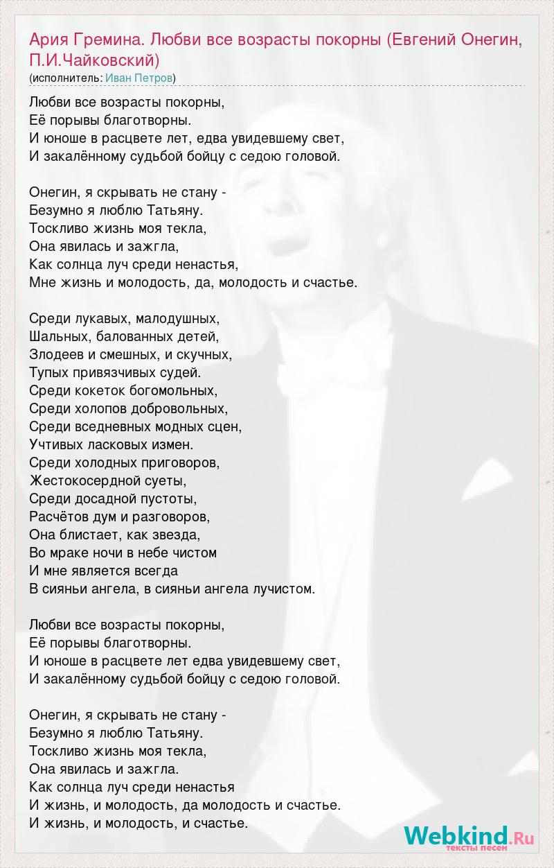 Любви все возрасты покорны, Её порывы благотворны. И юноше в расцвете лет, едва увидевшему свет, И закалённому судьбой бойцу с седою головой. Онегин, я скрывать не стану - Безумно я люблю Татьяну. Тоскливо жизнь моя текла, Она явилась и зажгла, Как солнца луч среди ненастья, Мне жизнь и молодость, да, молодость и счастье. Среди лукавых, малодушных, Шальных, балованных детей, Злодеев и смешных, и скучных, Тупых привязчивых судей. Среди кокеток богомольных, Среди холопов добровольных, Среди вседневных модных сцен, Учтивых ласковых измен. Среди холодных приговоров, Жестокосердной суеты, Среди досадной пустоты, Расчётов дум и разговоров, Она блистает, как звезда, Во мраке ночи в небе чистом И мне является всегда В сияньи ангела, в сияньи ангела лучистом. Любви все возрасты покорны, Её порывы благотворны. И юноше в расцвете лет едва увидевшему свет, И закалённому судьбой бойцу с седою головой. Онегин, я скрывать не стану - Безумно я люблю Татьяну. Тоскливо жизнь моя текла, Она явилась и зажгла. Как солнца луч среди ненастья И жизнь, и молодость, да молодость и счастье. И жизнь, и молодость, и счастье.