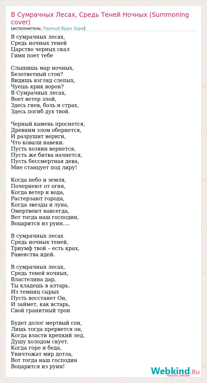В сумрачных лесах, Средь ночных теней Царство черных скал Гимн поет тебе Слышишь мар ночных, Безответный стон? Видишь взгляд слепых, Чуешь крик ворон? В Сумрачных лесах, Воет ветер злой, Здесь гнев, боль и страх, Здесь погиб дух твой. Черный камень проснется, Древним злом обернется, И разрушит вериги, Что ковали навеки. Пусть хозяин вернется, Пусть же битва начнется, Пусть бессмертная дева, Мне станцует под лиру! Когда небо и земля, Почернеют от огня, Когда ветер и вода, Растерзают города, Когда звезды и луна, Омертвеют навсегда, Вот тогда наш господин, Воцарится из руин…. В сумрачных лесах Средь ночных теней, Триумф твой – есть крах, Равенства идей. В сумрачных лесах, Средь теней ночных, Властелина дар, Ты кладешь в алтарь. Из темниц сырых Пусть восстанет Он, И займет, как встарь, Свой гранитный трон Будет долог мертвый сон, Лишь тогда прервется он, Когда власти крепкий лед, Душу холодом скует. Когда горе и беда, Уничтожат мир дотла, Вот тогда наш господин Воцарится из руин!
