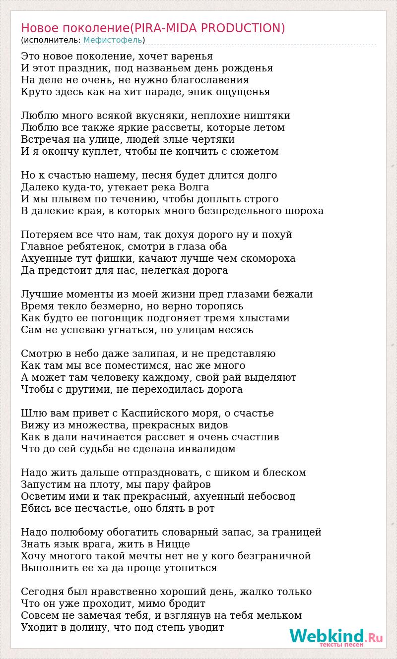 Это новое поколение, хочет варенья И этот праздник, под названьем день рожденья На деле не очень, не нужно благославения Круто здесь как на хит параде, эпик ощущенья Люблю много всякой вкусняки, неплохие ништяки Люблю все также яркие рассветы, которые летом Встречая на улице, людей злые чертяки И я окончу куплет, чтобы не кончить с сюжетом Но к счастью нашему, песня будет длится долго Далеко куда-то, утекает река Волга И мы плывем по течению, чтобы доплыть строго В далекие края, в которых много безпредельного шороха Потеряем все что нам, так дохуя дорого ну и похуй Главное ребятенок, смотри в глаза оба Ахуенные тут фишки, качают лучше чем скомороха Да предстоит для нас, нелегкая дорога Лучшие моменты из моей жизни пред глазами бежали Время текло безмерно, но верно торопясь Как будто ее погонщик подгоняет тремя хлыстами Сам не успеваю угнаться, по улицам несясь Смотрю в небо даже залипая, и не представляю Как там мы все поместимся, нас же много А может там человеку каждому, свой рай выделяют Чтобы с другими, не переходилась дорога Шлю вам привет с Каспийского моря, о счастье Вижу из множества, прекрасных видов Как в дали начинается рассвет я очень счастлив Что до сей судьба не сделала инвалидом Надо жить дальше отпраздновать, с шиком и блеском Запустим на плоту, мы пару файров Осветим ими и так прекрасный, ахуенный небосвод Ебись все несчастье, оно блять в рот Надо полюбому обогатить словарный запас, за границей Знать язык врага, жить в Ницце Хочу многого такой мечты нет не у кого безграничной Выполнить ее ха да проще утопиться Сегодня был нравственно хороший день, жалко только Что он уже проходит, мимо бродит Совсем не замечая тебя, и взглянув на тебя мельком Уходит в долину, что под степь уводит