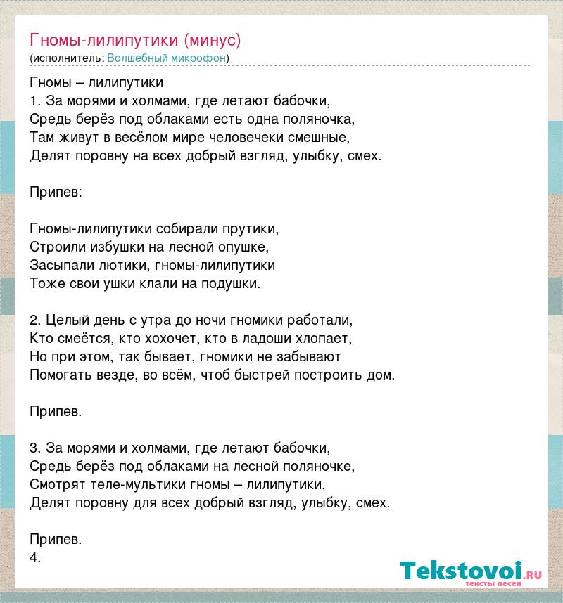 Гномы – лилипутики 1. За морями и холмами, где летают бабочки, Средь берёз под облаками есть одна поляночка, Там живут в весёлом мире человечеки смешные, Делят поровну на всех добрый взгляд, улыбку, смех. Припев: Гномы-лилипутики собирали прутики, Строили избушки на лесной опушке, Засыпали лютики, гномы-лилипутики Тоже свои ушки клали на подушки. 2. Целый день с утра до ночи гномики работали, Кто смеётся, кто хохочет, кто в ладоши хлопает, Но при этом, так бывает, гномики не забывают Помогать везде, во всём, чтоб быстрей построить дом. Припев. 3. За морями и холмами, где летают бабочки, Средь берёз под облаками на лесной поляночке, Смотрят теле-мультики гномы – лилипутики, Делят поровну для всех добрый взгляд, улыбку, смех. Припев. 4.