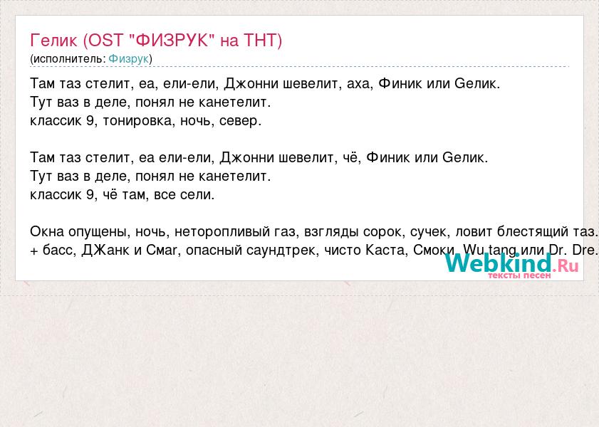 Там таз стелит, еа, ели-ели, Джонни шевелит, аха, Финик или Gелик. Тут ваз в деле, понял не канетелит. классик 9, тонировка, ночь, север. Там таз стелит, еа ели-ели, Джонни шевелит, чё, Финик или Gелик. Тут ваз в деле, понял не канетелит. классик 9, чё там, все сели. Окна опущены, ночь, неторопливый газ, взгляды сорок, сучек, ловит блестящий таз. + басс, ДЖанк и Смаr, опасный саундтрек, чисто Каста, Смоки, Wu tang или Dr. Dre.