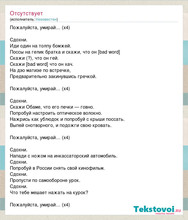 Пожалуйста, умирай… (x4) Сдохни. Иди один на толпу бомжей. Поссы на гелик братка и скажи, что он [bad word] Скажи (?), что он гей. Скажи [bad word] что он хач. На дэо матизе по встречке, Предварительно закинувшись гречкой. Пожалуйста, умирай… (x4) Сдохни. Скажи Обаме, что его печки — говно. Попробуй настроить оптическое волокно. Нажрись как ублюдок и попробуй с крыши поссать. Выпей снотворного, и подожги свою кровать. Пожалуйста, умирай… (x4) Сдохни. Напади с ножом на инкассаторский автомобиль. Сдохни. Попробуй в России снять свой кинофильм. Сдохни. Пропусти по самообороне урок. Сдохни. Что тебе мешает нажать на курок? Пожалуйста, умирай… (x4)