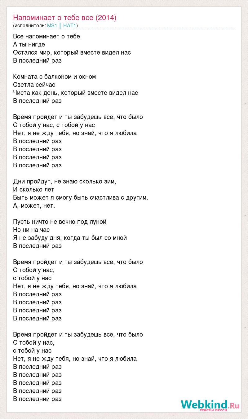 Все напоминает о тебе А ты нигде Остался мир, который вместе видел нас В последний раз Комната с балконом и окном Светла сейчас Чиста как день, который вместе видел нас В последний раз Время пройдет и ты забудешь все, что было С тобой у нас, с тобой у нас Нет, я не жду тебя, но знай, что я любила В последний раз В последний раз В последний раз В последний раз Дни пройдут, не знаю сколько зим, И сколько лет Быть может я смогу быть счастлива с другим, А, может, нет. Пусть ничто не вечно под луной Но ни на час Я не забуду дня, когда ты был со мной В последний раз Время пройдет и ты забудешь все, что было С тобой у нас, с тобой у нас Нет, я не жду тебя, но знай, что я любила В последний раз В последний раз В последний раз В последний раз Время пройдет и ты забудешь все, что было С тобой у нас, с тобой у нас Нет, я не жду тебя, но знай, что я любила В последний раз В последний раз В последний раз В последний раз В последний раз