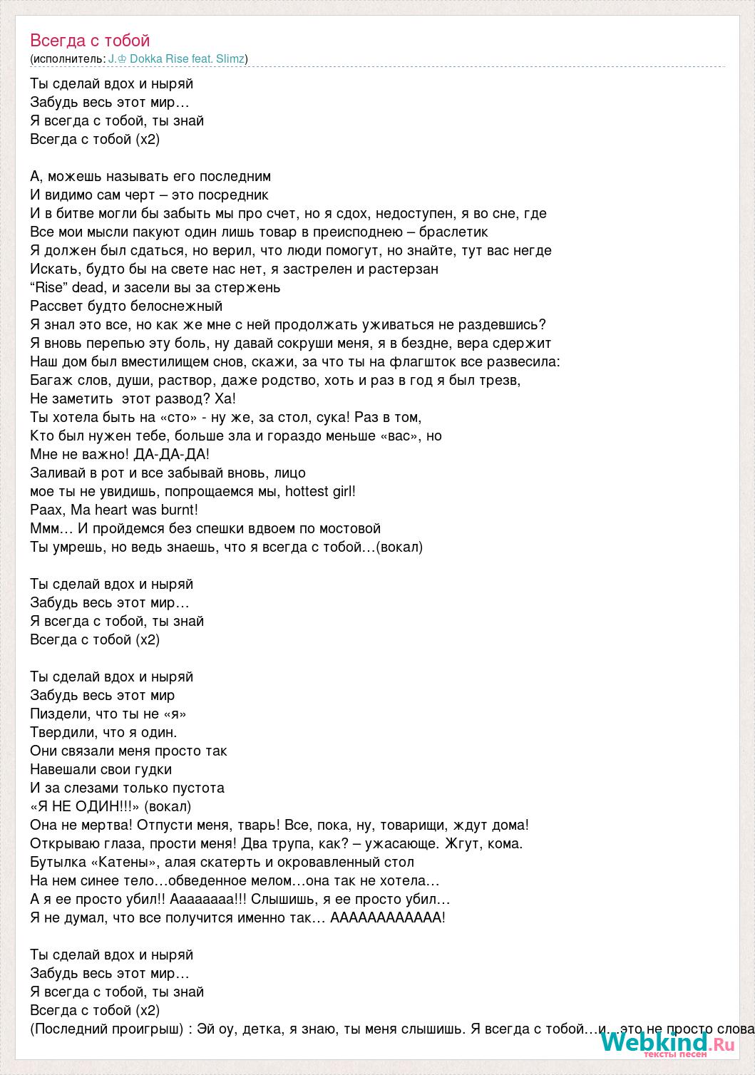 Ты сделай вдох и ныряй Забудь весь этот мир… Я всегда с тобой, ты знай Всегда с тобой (х2) А, можешь называть его последним И видимо сам черт – это посредник И в битве могли бы забыть мы про счет, но я сдох, недоступен, я во сне, где Все мои мысли пакуют один лишь товар в преисподнею – браслетик Я должен был сдаться, но верил, что люди помогут, но знайте, тут вас негде Искать, будто бы на свете нас нет, я застрелен и растерзан “Rise” dead, и засели вы за стержень Рассвет будто белоснежный Я знал это все, но как же мне с ней продолжать уживаться не раздевшись? Я вновь перепью эту боль, ну давай сокруши меня, я в бездне, вера сдержит Наш дом был вместилищем снов, скажи, за что ты на флагшток все развесила: Багаж слов, души, раствор, даже родство, хоть и раз в год я был трезв, Не заметить этот развод? Ха! Ты хотела быть на «сто» - ну же, за стол, сука! Раз в том, Кто был нужен тебе, больше зла и гораздо меньше «вас», но Мне не важно! ДА-ДА-ДА! Заливай в рот и все забывай вновь, лицо мое ты не увидишь, попрощаемся мы, hottest girl! Раах, Ma heart was burnt! Ммм… И пройдемся без спешки вдвоем по мостовой Ты умрешь, но ведь знаешь, что я всегда с тобой…(вокал) Ты сделай вдох и ныряй Забудь весь этот мир… Я всегда с тобой, ты знай Всегда с тобой (х2) Ты сделай вдох и ныряй Забудь весь этот мир Пиздели, что ты не «я» Твердили, что я один. Они связали меня просто так Навешали свои гудки И за слезами только пустота «Я НЕ ОДИН!!!» (вокал) Она не мертва! Отпусти меня, тварь! Все, пока, ну, товарищи, ждут дома! Открываю глаза, прости меня! Два трупа, как? – ужасающе. Жгут, кома. Бутылка «Катены», алая скатерть и окровавленный стол На нем синее тело…обведенное мелом…она так не хотела… А я ее просто убил!! Аааааааа!!! Слышишь, я ее просто убил… Я не думал, что все получится именно так… АААААААААААА! Ты сделай вдох и ныряй Забудь весь этот мир… Я всегда с тобой, ты знай Всегда с тобой (х2) (Последний проигрыш) : Эй оу, детка, я знаю, ты меня слышишь. Я всегда с тобой…и…это не просто слова