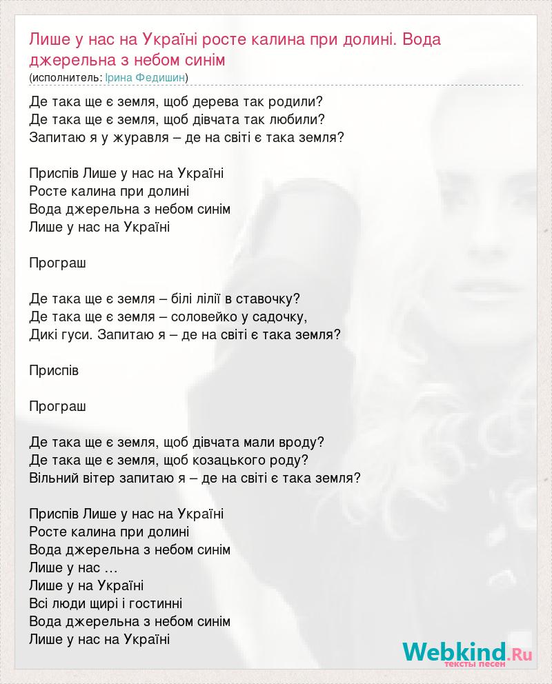 Главная→Исполнители→Ірина Федишин→Лише у нас на Україні росте калина при долині. Вода джерельна з небом синім