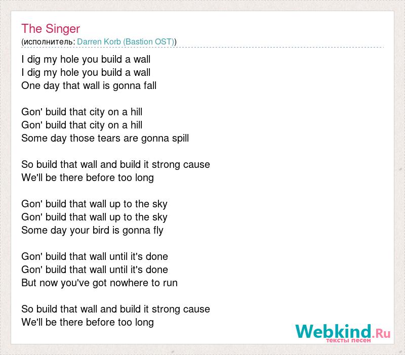 I dig my hole you build a wall I dig my hole you build a wall One day that wall is gonna fall Gon' build that city on a hill Gon' build that city on a hill Some day those tears are gonna spill So build that wall and build it strong cause We'll be there before too long Gon' build that wall up to the sky Gon' build that wall up to the sky Some day your bird is gonna fly Gon' build that wall until it's done Gon' build that wall until it's done But now you've got nowhere to run So build that wall and build it strong cause We'll be there before too long
