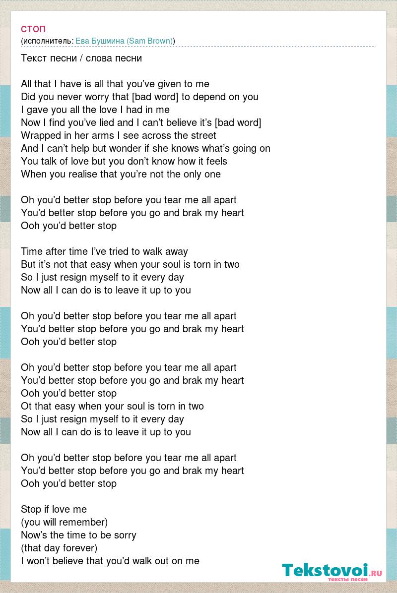 Текст песни / слова песни All that I have is all that you’ve given to me Did you never worry that I’d come to depend on you I gave you all the love I had in me Now I find you’ve lied and I can’t believe it’s true Wrapped in her arms I see across the street And I can’t help but wonder if she knows what’s going on You talk of love but you don’t know how it feels When you realise that you’re not the only one Oh you’d better stop before you tear me all apart You’d better stop before you go and brak my heart Ooh you’d better stop Time after time I’ve tried to walk away But it’s not that easy when your soul is torn in two So I just resign myself to it every day Now all I can do is to leave it up to you Oh you’d better stop before you tear me all apart You’d better stop before you go and brak my heart Ooh you’d better stop Oh you’d better stop before you tear me all apart You’d better stop before you go and brak my heart Ooh you’d better stop Ot that easy when your soul is torn in two So I just resign myself to it every day Now all I can do is to leave it up to you Oh you’d better stop before you tear me all apart You’d better stop before you go and brak my heart Ooh you’d better stop Stop if love me (you will remember) Now’s the time to be sorry (that day forever) I won’t believe that you’d walk out on me