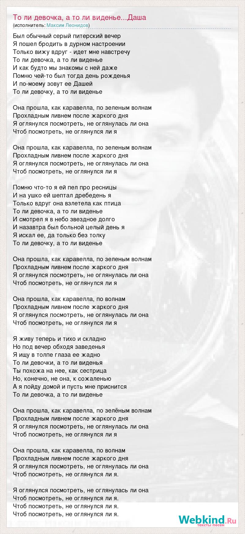 Был обычный серый питерский вечер Я пошел бродить в дурном настроении Только вижу вдруг - идет мне навстречу То ли девочка, а то ли виденье И как будто мы знакомы с ней даже Помню чей-то был тогда день рожденья И по-моему зовут ее Дашей То ли девочку, а то ли виденье Она прошла, как каравелла, по зеленым волнам Прохладным ливнем после жаркого дня Я оглянулся посмотреть, не оглянулась ли она Чтоб посмотреть, не оглянулся ли я Она прошла, как каравелла, по зеленым волнам Прохладным ливнем после жаркого дня Я оглянулся посмотреть, не оглянулась ли она Чтоб посмотреть, не оглянулся ли я Помню что-то я ей пел про ресницы И на ушко ей шептал дребедень я Только вдруг она взлетела как птица То ли девочка, а то ли виденье И смотрел я в небо звездное долго И назавтра был больной целый день я Я искал ее, да только без толку То ли девочку, а то ли виденье Она прошла, как каравелла, по зеленым волнам Прохладным ливнем после жаркого дня Я оглянулся посмотреть, не оглянулась ли она Чтоб посмотреть, не оглянулся ли я Она прошла, как каравелла, по волнам Прохладным ливнем после жаркого дня Я оглянулся посмотреть, не оглянулась ли она Чтоб посмотреть, не оглянулся ли я Я живу теперь и тихо и складно Но под вечер обходя заведенья Я ищу в толпе глаза ее жадно То ли девочки, а то ли виденья Ты похожа на нее, как сестрица Но, конечно, не она, к сожаленью А я пойду домой и пусть мне приснится То ли девочка, а то ли виденье Она прошла, как каравелла, по зелёным волнам Прохладным ливнем после жаркого дня Я оглянулся посмотреть, не оглянулась ли она Чтоб посмотреть, не оглянулся ли я Она прошла, как каравелла, по волнам Прохладным ливнем после жаркого дня Я оглянулся посмотреть, не оглянулась ли она Чтоб посмотреть, не оглянулся ли я. Я оглянулся посмотреть, не оглянулась ли она Чтоб посмотреть, не оглянулся ли я. Чтоб посмотреть, не оглянулся ли я. Чтоб посмотреть, не оглянулся ли я.