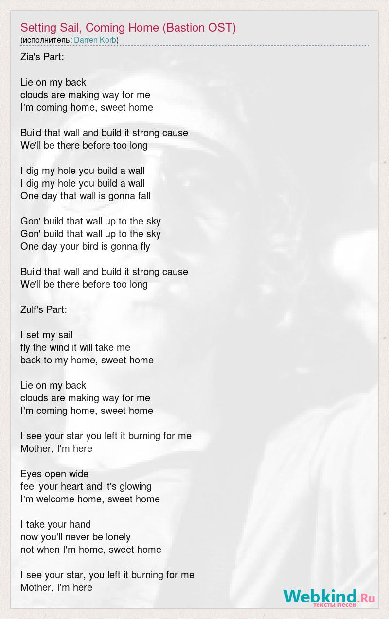Zia's Part: Lie on my back clouds are making way for me I'm coming home, sweet home Build that wall and build it strong cause We'll be there before too long I dig my hole you build a wall I dig my hole you build a wall One day that wall is gonna fall Gon' build that wall up to the sky Gon' build that wall up to the sky One day your bird is gonna fly Build that wall and build it strong cause We'll be there before too long Zulf's Part: I set my sail fly the wind it will take me back to my home, sweet home Lie on my back clouds are making way for me I'm coming home, sweet home I see your star you left it burning for me Mother, I'm here Eyes open wide feel your heart and it's glowing I'm welcome home, sweet home I take your hand now you'll never be lonely not when I'm home, sweet home I see your star, you left it burning for me Mother, I'm here