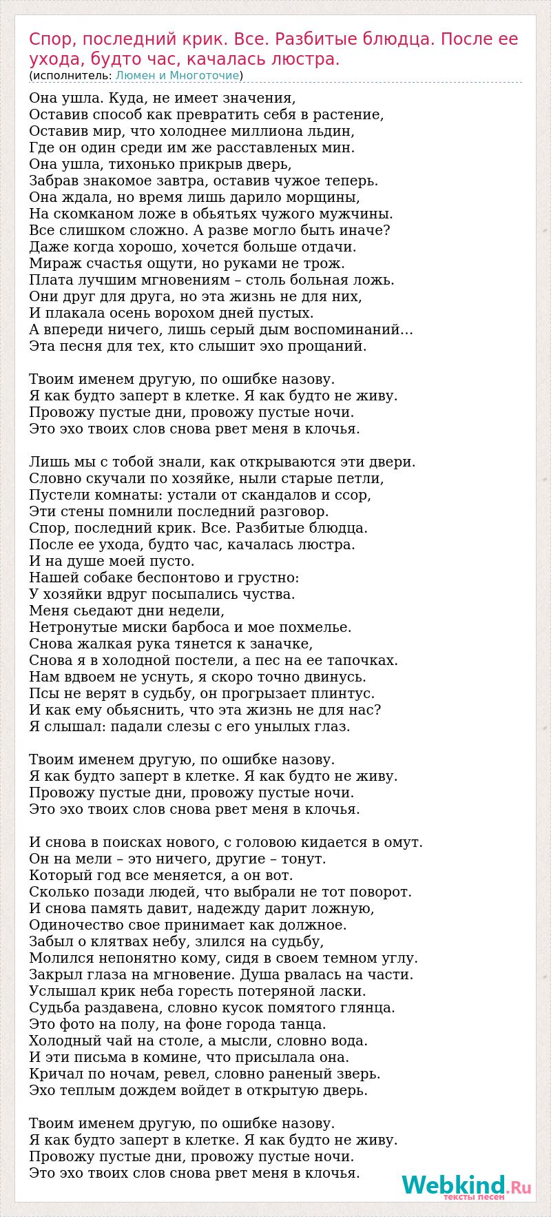Главная→Исполнители→Люмен и Многоточие→Спор, последний крик. Все. Разбитые блюдца. После ее ухода, будто час, качала