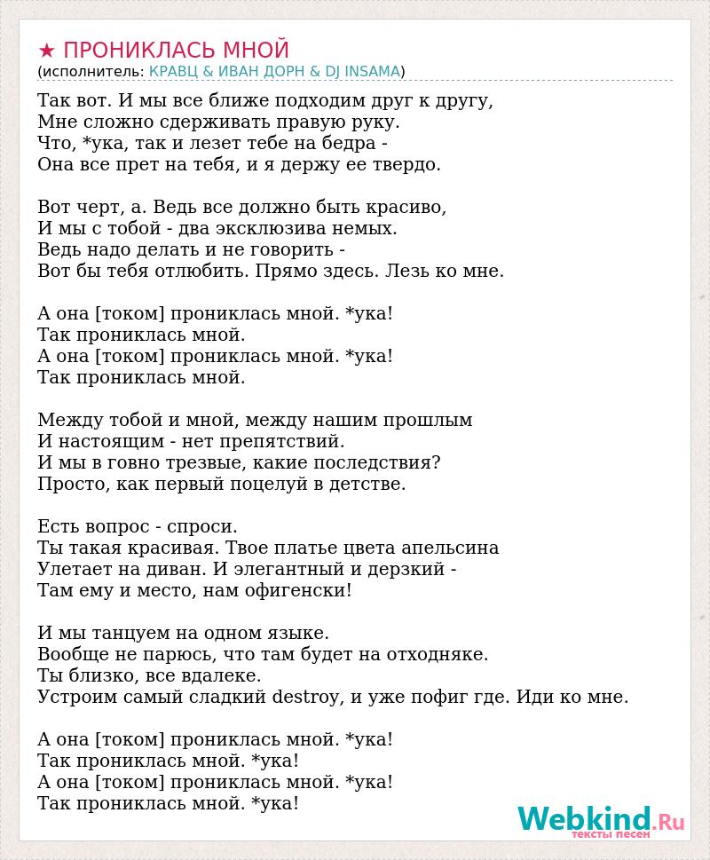 Так вот. И мы все ближе подходим друг к другу, Мне сложно сдерживать правую руку. Что, *ука, так и лезет тебе на бедра - Она все прет на тебя, и я держу ее твердо. Вот черт, а. Ведь все должно быть красиво, И мы с тобой - два эксклюзива немых. Ведь надо делать и не говорить - Вот бы тебя отлюбить. Прямо здесь. Лезь ко мне. А она [током] прониклась мной. *ука! Так прониклась мной. А она [током] прониклась мной. *ука! Так прониклась мной. Между тобой и мной, между нашим прошлым И настоящим - нет препятствий. И мы в говно трезвые, какие последствия? Просто, как первый поцелуй в детстве. Есть вопрос - спроси. Ты такая красивая. Твое платье цвета апельсина Улетает на диван. И элегантный и дерзкий - Там ему и место, нам офигенски! И мы танцуем на одном языке. Вообще не парюсь, что там будет на отходняке. Ты близко, все вдалеке. Устроим самый сладкий destroy, и уже пофиг где. Иди ко мне. А она [током] прониклась мной. *ука! Так прониклась мной. *ука! А она [током] прониклась мной. *ука! Так прониклась мной. *ука!