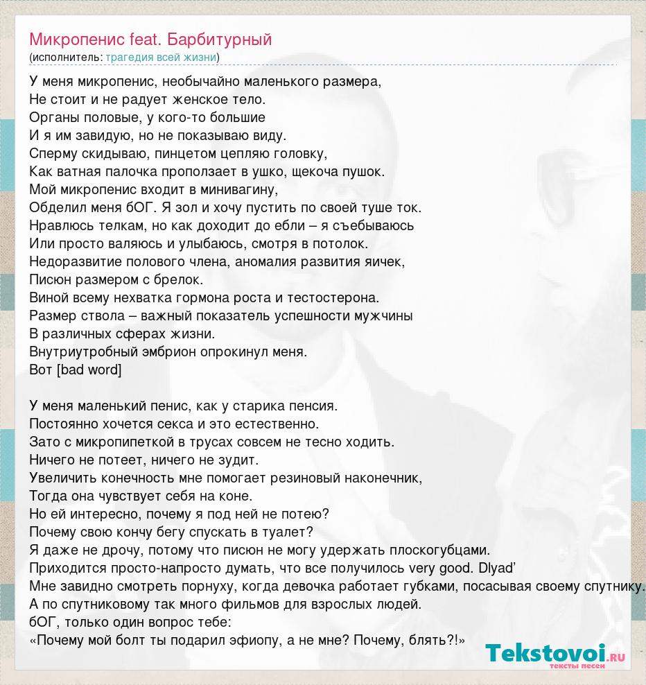 У меня микропенис, необычайно маленького размера, Не стоит и не радует женское тело. Органы половые, у кого-то большие И я им завидую, но не показываю виду. Сперму скидываю, пинцетом цепляю головку, Как ватная палочка проползает в ушко, щекоча пушок. Мой микропенис входит в минивагину, Обделил меня бОГ. Я зол и хочу пустить по своей туше ток. Нравлюсь телкам, но как доходит до ебли – я съебываюсь Или просто валяюсь и улыбаюсь, смотря в потолок. Недоразвитие полового члена, аномалия развития яичек, Писюн размером с брелок. Виной всему нехватка гормона роста и тестостерона. Размер ствола – важный показатель успешности мужчины В различных сферах жизни. Внутриутробный эмбрион опрокинул меня. Вот [bad word] У меня маленький пенис, как у старика пенсия. Постоянно хочется секса и это естественно. Зато с микропипеткой в трусах совсем не тесно ходить. Ничего не потеет, ничего не зудит. Увеличить конечность мне помогает резиновый наконечник, Тогда она чувствует себя на коне. Но ей интересно, почему я под ней не потею? Почему свою кончу бегу спускать в туалет? Я даже не дрочу, потому что писюн не могу удержать плоскогубцами. Приходится просто-напросто думать, что все получилось very good. Dlyad’ Мне завидно смотреть порнуху, когда девочка работает губками, посасывая своему спутнику. А по спутниковому так много фильмов для взрослых людей. бОГ, только один вопрос тебе: «Почему мой болт ты подарил эфиопу, а не мне? Почему, блять?!»