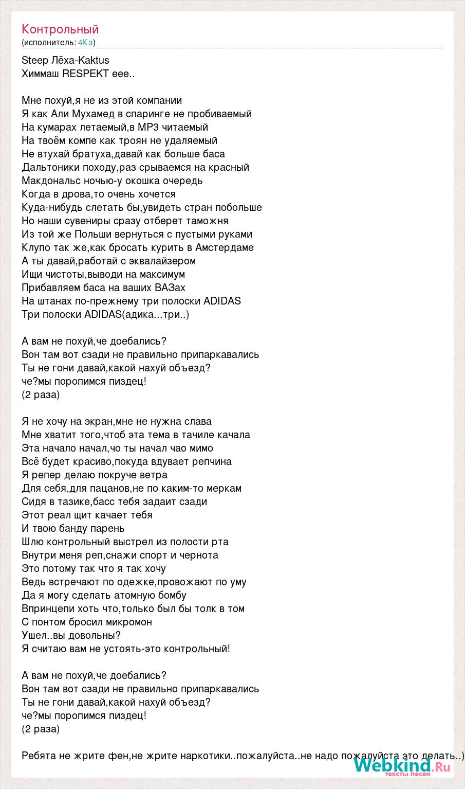 Steep Лёха-Kaktus Химмаш RESPEKT еее.. Мне похуй,я не из этой компании Я как Али Мухамед в спаринге не пробиваемый На кумарах летаемый,в MP3 читаемый На твоём компе как троян не удаляемый Не втухай братуха,давай как больше баса Дальтоники походу,раз срываемся на красный Макдональс ночью-у окошка очередь Когда в дрова,то очень хочется Куда-нибудь слетать бы,увидеть стран побольше Но наши сувениры сразу отберет таможня Из той же Польши вернуться с пустыми руками Клупо так же,как бросать курить в Амстердаме А ты давай,работай с эквалайзером Ищи чистоты,выводи на максимум Прибавляем баса на ваших ВАЗах На штанах по-прежнему три полоски ADIDAS Три полоски ADIDAS(адика...три..) А вам не похуй,че доебались? Вон там вот сзади не правильно припаркавались Ты не гони давай,какой нахуй объезд? че?мы поропимся пиздец! (2 раза) Я не хочу на экран,мне не нужна слава Мне хватит того,чтоб эта тема в тачиле качала Эта начало начал,чо ты начал чао мимо Всё будет красиво,покуда вдувает репчина Я репер делаю покруче ветра Для себя,для пацанов,не по каким-то меркам Сидя в тазике,басс тебя задаит сзади Этот реал щит качает тебя И твою банду парень Шлю контрольный выстрел из полости рта Внутри меня реп,снажи спорт и чернота Это потому так что я так хочу Ведь встречают по одежке,провожают по уму Да я могу сделать атомную бомбу Впринцепи хоть что,только был бы толк в том С понтом бросил микромон Ушел..вы довольны? Я считаю вам не устоять-это контрольный! А вам не похуй,че доебались? Вон там вот сзади не правильно припаркавались Ты не гони давай,какой нахуй объезд? че?мы поропимся пиздец! (2 раза) Ребята не жрите фен,не жрите наркотики..пожалуйста..не надо пожалуйста это делать..)