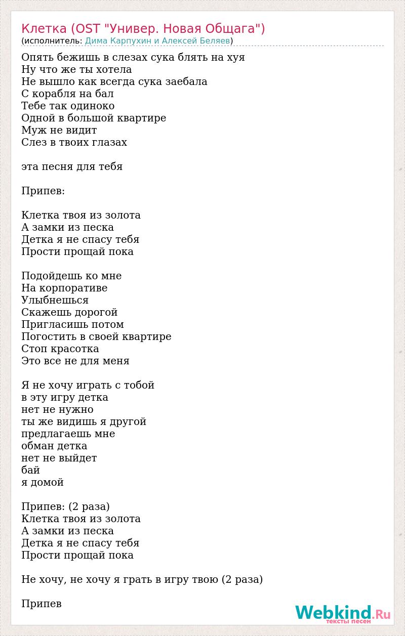 Опять бежишь в слезах сука блять на хуя Ну что же ты хотела Не вышло как всегда сука заебала С корабля на бал Тебе так одиноко Одной в большой квартире Муж не видит Слез в твоих глазах эта песня для тебя Припев: Клетка твоя из золота А замки из песка Детка я не спасу тебя Прости прощай пока Подойдешь ко мне На корпоративе Улыбнешься Скажешь дорогой Пригласишь потом Погостить в своей квартире Стоп красотка Это все не для меня Я не хочу играть с тобой в эту игру детка нет не нужно ты же видишь я другой предлагаешь мне обман детка нет не выйдет бай я домой Припев: (2 раза) Клетка твоя из золота А замки из песка Детка я не спасу тебя Прости прощай пока Не хочу, не хочу я грать в игру твою (2 раза) Припев