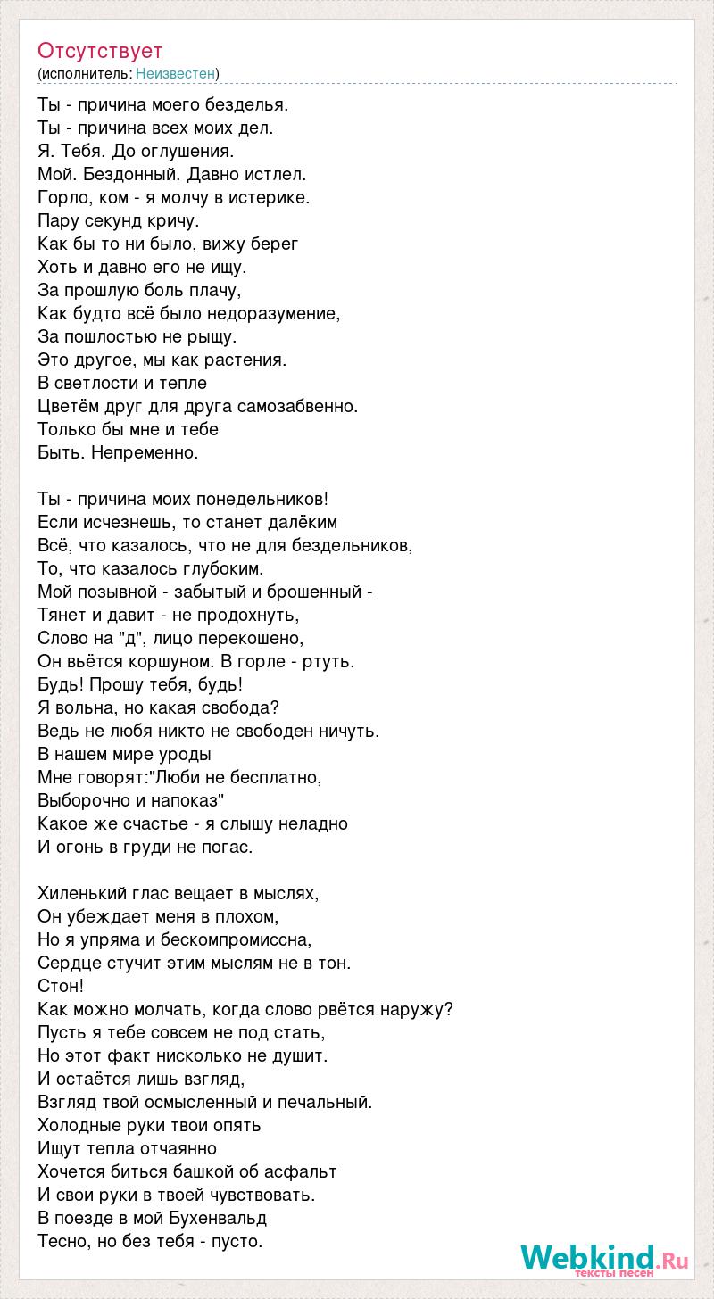 Ты - причина моего безделья. Ты - причина всех моих дел. Я. Тебя. До оглушения. Мой. Бездонный. Давно истлел. Горло, ком - я молчу в истерике. Пару секунд кричу. Как бы то ни было, вижу берег Хоть и давно его не ищу. За прошлую боль плачу, Как будто всё было недоразумение, За пошлостью не рыщу. Это другое, мы как растения. В светлости и тепле Цветём друг для друга самозабвенно. Только бы мне и тебе Быть. Непременно. Ты - причина моих понедельников! Если исчезнешь, то станет далёким Всё, что казалось, что не для бездельников, То, что казалось глубоким. Мой позывной - забытый и брошенный - Тянет и давит - не продохнуть, Слово на "д", лицо перекошено, Он вьётся коршуном. В горле - ртуть. Будь! Прошу тебя, будь! Я вольна, но какая свобода? Ведь не любя никто не свободен ничуть. В нашем мире уроды Мне говорят:"Люби не бесплатно, Выборочно и напоказ" Какое же счастье - я слышу неладно И огонь в груди не погас. Хиленький глас вещает в мыслях, Он убеждает меня в плохом, Но я упряма и бескомпромиссна, Сердце стучит этим мыслям не в тон. Стон! Как можно молчать, когда слово рвётся наружу? Пусть я тебе совсем не под стать, Но этот факт нисколько не душит. И остаётся лишь взгляд, Взгляд твой осмысленный и печальный. Холодные руки твои опять Ищут тепла отчаянно Хочется биться башкой об асфальт И свои руки в твоей чувствовать. В поезде в мой Бухенвальд Тесно, но без тебя - пусто.