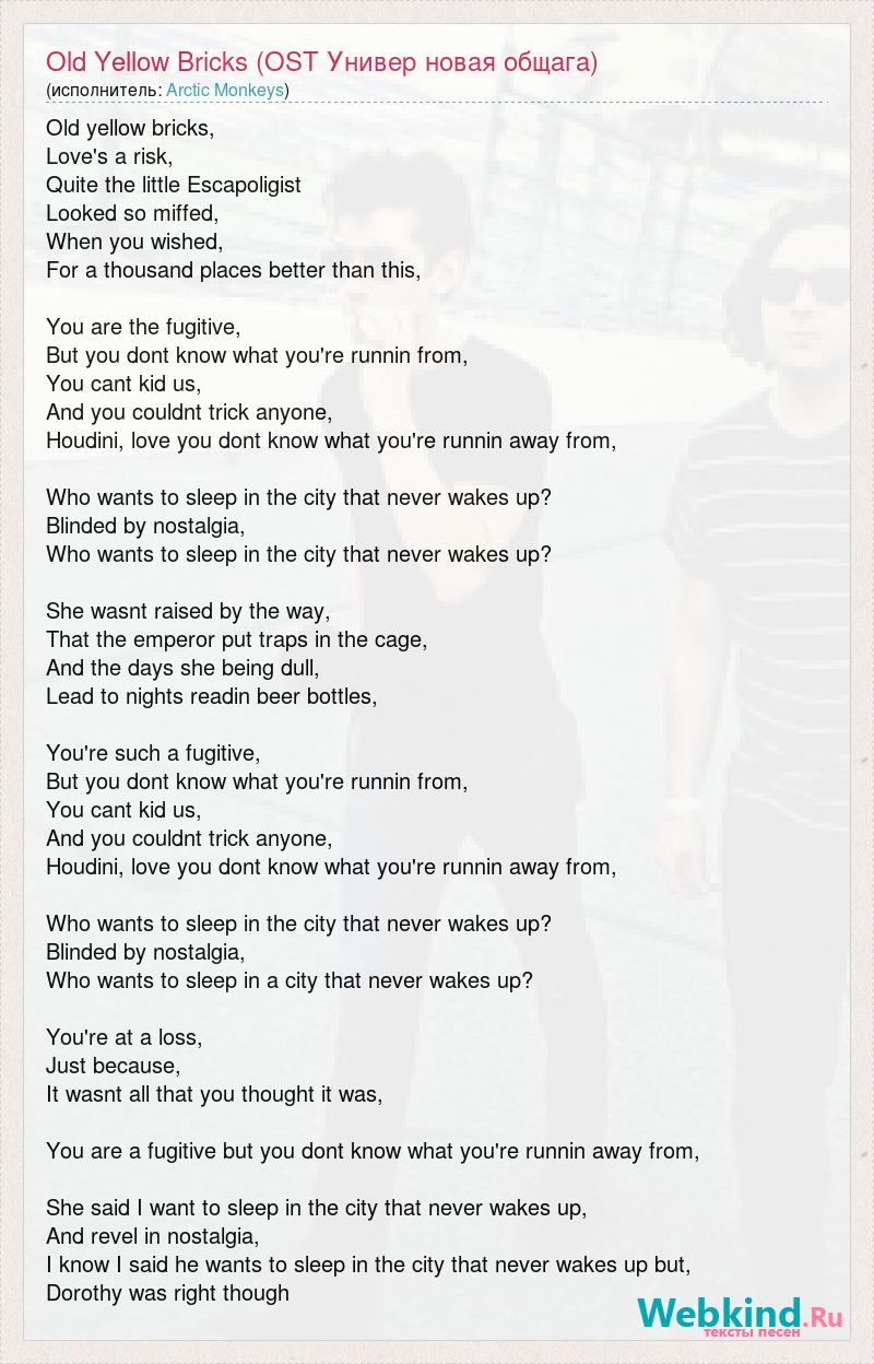 Old yellow bricks, Love's a risk, Quite the little Escapoligist Looked so miffed, When you wished, For a thousand places better than this, You are the fugitive, But you dont know what you're runnin from, You cant kid us, And you couldnt trick anyone, Houdini, love you dont know what you're runnin away from, Who wants to sleep in the city that never wakes up? Blinded by nostalgia, Who wants to sleep in the city that never wakes up? She wasnt raised by the way, That the emperor put traps in the cage, And the days she being dull, Lead to nights readin beer bottles, You're such a fugitive, But you dont know what you're runnin from, You cant kid us, And you couldnt trick anyone, Houdini, love you dont know what you're runnin away from, Who wants to sleep in the city that never wakes up? Blinded by nostalgia, Who wants to sleep in a city that never wakes up? You're at a loss, Just because, It wasnt all that you thought it was, You are a fugitive but you dont know what you're runnin away from, She said I want to sleep in the city that never wakes up, And revel in nostalgia, I know I said he wants to sleep in the city that never wakes up but, Dorothy was right though