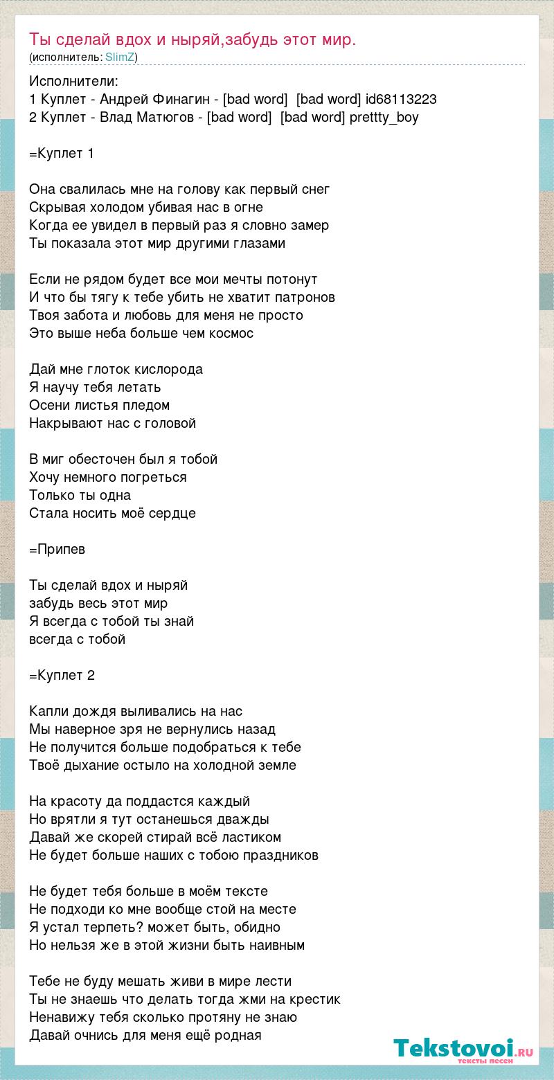 Исполнители: 1 Куплет - Андрей Финагин - [bad word] [bad word] id68113223 2 Куплет - Влад Матюгов - [bad word] [bad word] prettty_boy =Куплет 1 Она свалилась мне на голову как первый снег Скрывая холодом убивая нас в огне Когда ее увидел в первый раз я словно замер Ты показала этот мир другими глазами Если не рядом будет все мои мечты потонут И что бы тягу к тебе убить не хватит патронов Твоя забота и любовь для меня не просто Это выше неба больше чем космос Дай мне глоток кислорода Я научу тебя летать Осени листья пледом Накрывают нас с головой В миг обесточен был я тобой Хочу немного погреться Только ты одна Стала носить моё сердце =Припев Ты сделай вдох и ныряй забудь весь этот мир Я всегда с тобой ты знай всегда с тобой =Куплет 2 Капли дождя выливались на нас Мы наверное зря не вернулись назад Не получится больше подобраться к тебе Твоё дыхание остыло на холодной земле На красоту да поддастся каждый Но врятли я тут останешься дважды Давай же скорей стирай всё ластиком Не будет больше наших с тобою праздников Не будет тебя больше в моём тексте Не подходи ко мне вообще стой на месте Я устал терпеть? может быть, обидно Но нельзя же в этой жизни быть наивным Тебе не буду мешать живи в мире лести Ты не знаешь что делать тогда жми на крестик Ненавижу тебя сколько протяну не знаю Давай очнись для меня ещё родная
