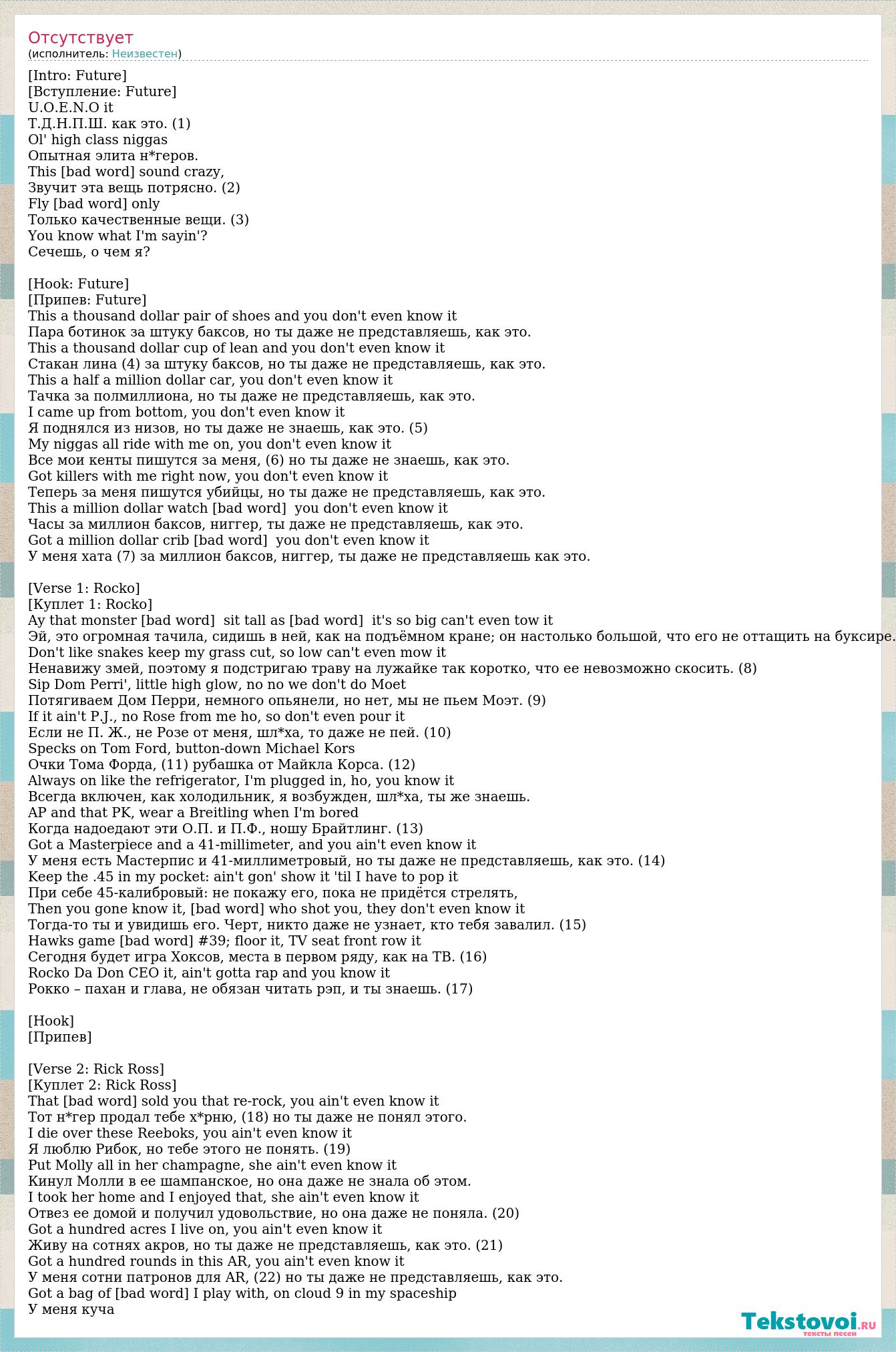 [Intro: Future] [Вступление: Future] U.O.E.N.O it Т.Д.Н.П.Ш. как это. (1) Ol' high class niggas Опытная элита н*геров. This shit sound crazy, Звучит эта вещь потрясно. (2) Fly shit only Только качественные вещи. (3) You know what I'm sayin'? Сечешь, о чем я? [Hook: Future] [Припев: Future] This a thousand dollar pair of shoes and you don't even know it Пара ботинок за штуку баксов, но ты даже не представляешь, как это. This a thousand dollar cup of lean and you don't even know it Стакан лина (4) за штуку баксов, но ты даже не представляешь, как это. This a half a million dollar car, you don't even know it Тачка за полмиллиона, но ты даже не представляешь, как это. I came up from bottom, you don't even know it Я поднялся из низов, но ты даже не знаешь, как это. (5) My niggas all ride with me on, you don't even know it Все мои кенты пишутся за меня, (6) но ты даже не знаешь, как это. Got killers with me right now, you don't even know it Теперь за меня пишутся убийцы, но ты даже не представляешь, как это. This a million dollar watch nigga, you don't even know it Часы за миллион баксов, ниггер, ты даже не представляешь, как это. Got a million dollar crib nigga, you don't even know it У меня хата (7) за миллион баксов, ниггер, ты даже не представляешь как это. [Verse 1: Rocko] [Куплет 1: Rocko] Ay that monster truck, sit tall as fuck, it's so big can't even tow it Эй, это огромная тачила, сидишь в ней, как на подъёмном кране; он настолько большой, что его не оттащить на буксире. Don't like snakes keep my grass cut, so low can't even mow it Ненавижу змей, поэтому я подстригаю траву на лужайке так коротко, что ее невозможно скосить. (8) Sip Dom Perri', little high glow, no no we don't do Moet Потягиваем Дом Перри, немного опьянели, но нет, мы не пьем Моэт. (9) If it ain't P.J., no Rose from me ho, so don't even pour it Если не П. Ж., не Розе от меня, шл*ха, то даже не пей. (10) Specks on Tom Ford, button-down Michael Kors Очки Тома Форда, (11) рубашка от Майкла Корса. (12) Always on like the refrigerator, I'm plugged in, ho, you know it Всегда включен, как холодильник, я возбужден, шл*ха, ты же знаешь. AP and that PK, wear a Breitling when I'm bored Когда надоедают эти О.П. и П.Ф., ношу Брайтлинг. (13) Got a Masterpiece and a 41-millimeter, and you ain't even know it У меня есть Мастерпис и 41-миллиметровый, но ты даже не представляешь, как это. (14) Keep the .45 in my pocket: ain't gon' show it 'til I have to pop it При себе 45-калибровый: не покажу его, пока не придётся стрелять, Then you gone know it, damn who shot you, they don't even know it Тогда-то ты и увидишь его. Черт, никто даже не узнает, кто тебя завалил. (15) Hawks game fuckin' floor it, TV seat front row it Сегодня будет игра Хоксов, места в первом ряду, как на ТВ. (16) Rocko Da Don CEO it, ain't gotta rap and you know it Рокко – пахан и глава, не обязан читать рэп, и ты знаешь. (17) [Hook] [Припев] [Verse 2: Rick Ross] [Куплет 2: Rick Ross] That nigga sold you that re-rock, you ain't even know it Тот н*гер продал тебе х*рню, (18) но ты даже не понял этого. I die over these Reeboks, you ain't even know it Я люблю Рибок, но тебе этого не понять. (19) Put Molly all in her champagne, she ain't even know it Кинул Молли в ее шампанское, но она даже не знала об этом. I took her home and I enjoyed that, she ain't even know it Отвез ее домой и получил удовольствие, но она даже не поняла. (20) Got a hundred acres I live on, you ain't even know it Живу на сотнях акров, но ты даже не представляешь, как это. (21) Got a hundred rounds in this AR, you ain't even know it У меня сотни патронов для AR, (22) но ты даже не представляешь, как это. Got a bag of bitches I play with, on cloud 9 in my spaceship У меня куча