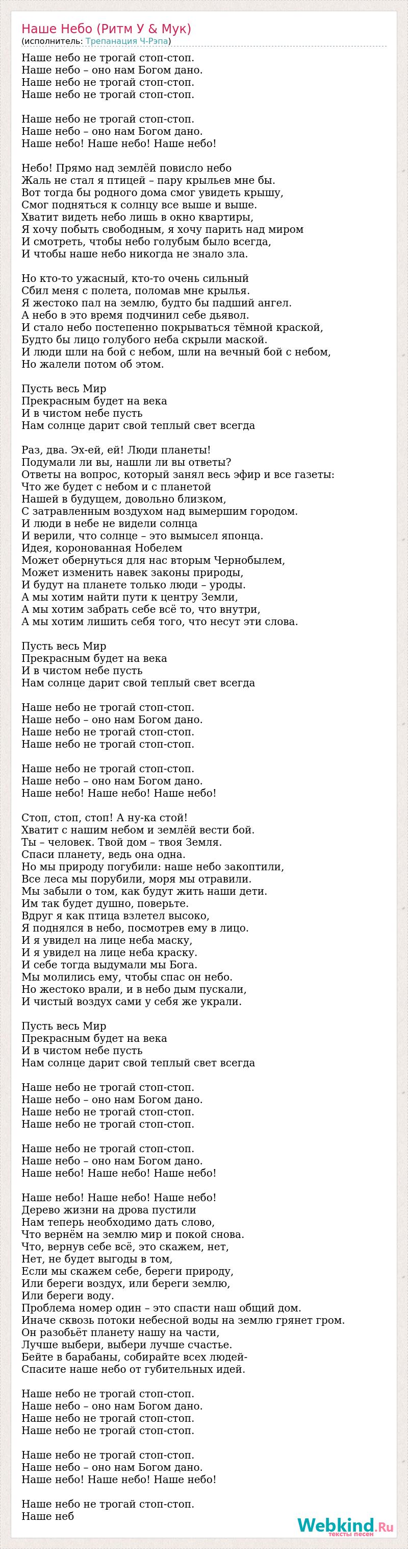 Наше небо не трогай стоп-стоп. Наше небо – оно нам Богом дано. Наше небо не трогай стоп-стоп. Наше небо не трогай стоп-стоп. Наше небо не трогай стоп-стоп. Наше небо – оно нам Богом дано. Наше небо! Наше небо! Наше небо! Небо! Прямо над землёй повисло небо Жаль не стал я птицей – пару крыльев мне бы. Вот тогда бы родного дома смог увидеть крышу, Смог подняться к солнцу все выше и выше. Хватит видеть небо лишь в окно квартиры, Я хочу побыть свободным, я хочу парить над миром И смотреть, чтобы небо голубым было всегда, И чтобы наше небо никогда не знало зла. Но кто-то ужасный, кто-то очень сильный Сбил меня с полета, поломав мне крылья. Я жестоко пал на землю, будто бы падший ангел. А небо в это время подчинил себе дьявол. И стало небо постепенно покрываться тёмной краской, Будто бы лицо голубого неба скрыли маской. И люди шли на бой с небом, шли на вечный бой с небом, Но жалели потом об этом. Пусть весь Мир Прекрасным будет на века И в чистом небе пусть Нам солнце дарит свой теплый свет всегда Раз, два. Эх-ей, ей! Люди планеты! Подумали ли вы, нашли ли вы ответы? Ответы на вопрос, который занял весь эфир и все газеты: Что же будет с небом и с планетой Нашей в будущем, довольно близком, С затравленным воздухом над вымершим городом. И люди в небе не видели солнца И верили, что солнце – это вымысел японца. Идея, коронованная Нобелем Может обернуться для нас вторым Чернобылем, Может изменить навек законы природы, И будут на планете только люди – уроды. А мы хотим найти пути к центру Земли, А мы хотим забрать себе всё то, что внутри, А мы хотим лишить себя того, что несут эти слова. Пусть весь Мир Прекрасным будет на века И в чистом небе пусть Нам солнце дарит свой теплый свет всегда Наше небо не трогай стоп-стоп. Наше небо – оно нам Богом дано. Наше небо не трогай стоп-стоп. Наше небо не трогай стоп-стоп. Наше небо не трогай стоп-стоп. Наше небо – оно нам Богом дано. Наше небо! Наше небо! Наше небо! Стоп, стоп, стоп! А ну-ка стой! Хватит с нашим небом и землёй вести бой. Ты – человек. Твой дом – твоя Земля. Спаси планету, ведь она одна. Но мы природу погубили: наше небо закоптили, Все леса мы порубили, моря мы отравили. Мы забыли о том, как будут жить наши дети. Им так будет душно, поверьте. Вдруг я как птица взлетел высоко, Я поднялся в небо, посмотрев ему в лицо. И я увидел на лице неба маску, И я увидел на лице неба краску. И себе тогда выдумали мы Бога. Мы молились ему, чтобы спас он небо. Но жестоко врали, и в небо дым пускали, И чистый воздух сами у себя же украли. Пусть весь Мир Прекрасным будет на века И в чистом небе пусть Нам солнце дарит свой теплый свет всегда Наше небо не трогай стоп-стоп. Наше небо – оно нам Богом дано. Наше небо не трогай стоп-стоп. Наше небо не трогай стоп-стоп. Наше небо не трогай стоп-стоп. Наше небо – оно нам Богом дано. Наше небо! Наше небо! Наше небо! Наше небо! Наше небо! Наше небо! Дерево жизни на дрова пустили Нам теперь необходимо дать слово, Что вернём на землю мир и покой снова. Что, вернув себе всё, это скажем, нет, Нет, не будет выгоды в том, Если мы скажем себе, береги природу, Или береги воздух, или береги землю, Или береги воду. Проблема номер один – это спасти наш общий дом. Иначе сквозь потоки небесной воды на землю грянет гром. Он разобьёт планету нашу на части, Лучше выбери, выбери лучше счастье. Бейте в барабаны, собирайте всех людей- Спасите наше небо от губ