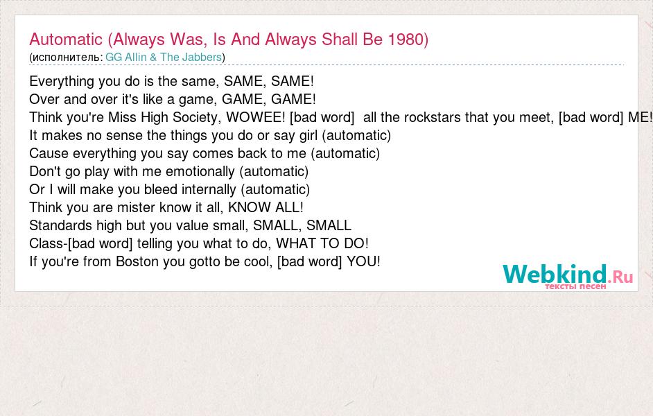 Everything you do is the same, SAME, SAME! Over and over it's like a game, GAME, GAME! Think you're Miss High Society, WOWEE! [bad word] all the rockstars that you meet, [bad word] ME! It makes no sense the things you do or say girl (automatic) Cause everything you say comes back to me (automatic) Don't go play with me emotionally (automatic) Or I will make you bleed internally (automatic) Think you are mister know it all, KNOW ALL! Standards high but you value small, SMALL, SMALL Class-[bad word] telling you what to do, WHAT TO DO! If you're from Boston you gotto be cool, [bad word] YOU!