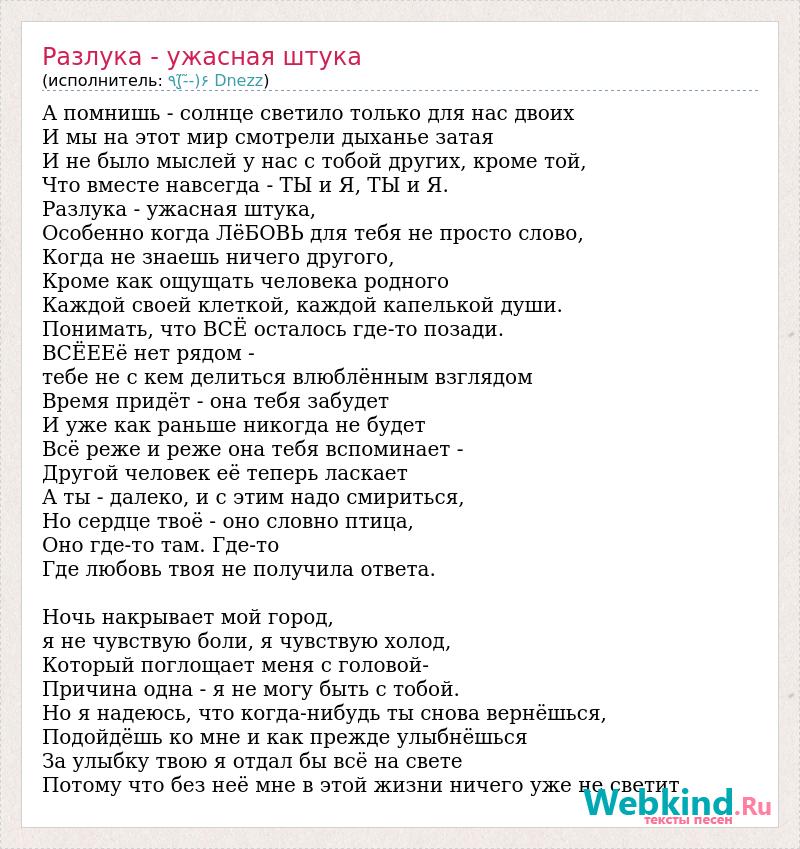 А помнишь - солнце светило только для нас двоих И мы на этот мир смотрели дыханье затая И не было мыслей у нас с тобой других, кроме той, Что вместе навсегда - ТЫ и Я, ТЫ и Я. Разлука - ужасная штука, Особенно когда ЛёБОВЬ для тебя не просто слово, Когда не знаешь ничего другого, Кроме как ощущать человека родного Каждой своей клеткой, каждой капелькой души. Понимать, что ВСЁ осталось где-то позади. ВСЁЕЕё нет рядом - тебе не с кем делиться влюблённым взглядом Время придёт - она тебя забудет И уже как раньше никогда не будет Всё реже и реже она тебя вспоминает - Другой человек её теперь ласкает А ты - далеко, и с этим надо смириться, Но сердце твоё - оно словно птица, Оно где-то там. Где-то Где любовь твоя не получила ответа. Ночь накрывает мой город, я не чувствую боли, я чувствую холод, Который поглощает меня с головой- Причина одна - я не могу быть с тобой. Но я надеюсь, что когда-нибудь ты снова вернёшься, Подойдёшь ко мне и как прежде улыбнёшься За улыбку твою я отдал бы всё на свете Потому что без неё мне в этой жизни ничего уже не светит