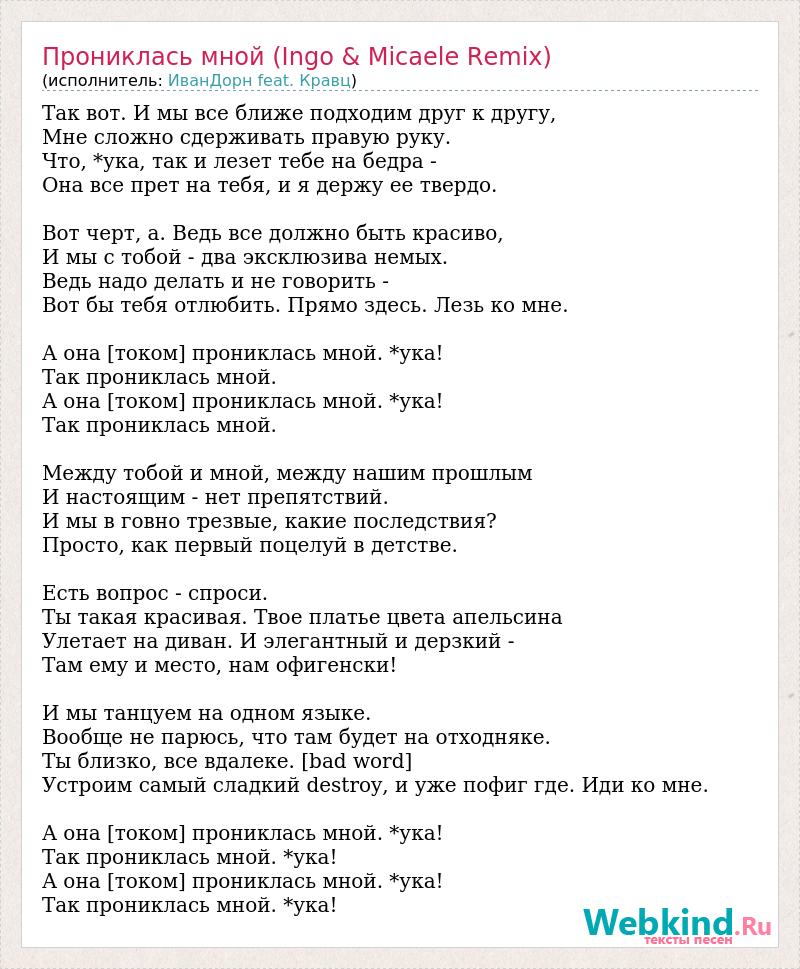 Так вот. И мы все ближе подходим друг к другу, Мне сложно сдерживать правую руку. Что, *ука, так и лезет тебе на бедра - Она все прет на тебя, и я держу ее твердо. Вот черт, а. Ведь все должно быть красиво, И мы с тобой - два эксклюзива немых. Ведь надо делать и не говорить - Вот бы тебя отлюбить. Прямо здесь. Лезь ко мне. А она [током] прониклась мной. *ука! Так прониклась мной. А она [током] прониклась мной. *ука! Так прониклась мной. Между тобой и мной, между нашим прошлым И настоящим - нет препятствий. И мы в говно трезвые, какие последствия? Просто, как первый поцелуй в детстве. Есть вопрос - спроси. Ты такая красивая. Твое платье цвета апельсина Улетает на диван. И элегантный и дерзкий - Там ему и место, нам офигенски! И мы танцуем на одном языке. Вообще не парюсь, что там будет на отходняке. Ты близко, все вдалеке. [bad word] Устроим самый сладкий destroy, и уже пофиг где. Иди ко мне. А она [током] прониклась мной. *ука! Так прониклась мной. *ука! А она [током] прониклась мной. *ука! Так прониклась мной. *ука!