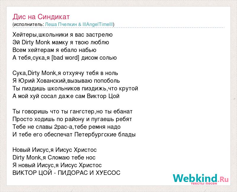 Хейтеры,школьники я вас застрелю Эй Dirty Monk мамку я твою люблю Всем хейтерам я ебало набью А тебя,сука,я [bad word] дисом солью Сука,Dirty Monk,я отхуячу тебя в ноль Я Юрий Хованский,вызываю попоболь Ты пиздишь школьников пиздижь,что крутой А мой хуй сосал даже сам Виктор Цой Ты говоришь что ты гангстер,но ты ебанат Просто ходишь по району и пугаешь ребят Тебе не славы 2pac-а,тебе ремня надо И тебе его обеспечат Петербургские блады Новый Иисус,я Иисус Христос Dirty Monk,я Сломаю тебе нос Я новый Иисус,я Иисус Христос ВИКТОР ЦОЙ - ПИДОРАС И ХУЕСОС