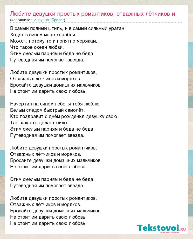 В самый полный штиль, и в самый сильный ураган Ходят в синем море корабли. Может, потому-то и понятно морякам, Что такое океан любви. Этим смелым парням и беда не беда Путеводная им помогает звезда. Любите девушки простых романтиков, Отважных лётчиков и моряков. Бросайте девушки домашних мальчиков, Не стоит им дарить свою любовь. Начертил на синем небе, я тебя люблю. Белым следом быстрый самолёт. Кто поздравит с днём рожденья девушку свою Так, как это делает пилот. Этим смелым парням и беда не беда Путеводная им помогает звезда. Любите девушки простых романтиков, Отважных лётчиков и моряков. Бросайте девушки домашних мальчиков, Не стоит им дарить свою любовь. Этим смелым парням и беда не беда Путеводная им помогает звезда. Любите девушки простых романтиков, Отважных лётчиков и моряков. Бросайте девушки домашних мальчиков, Не стоит им дарить свою любовь. Не стоит им дарить свою любовь