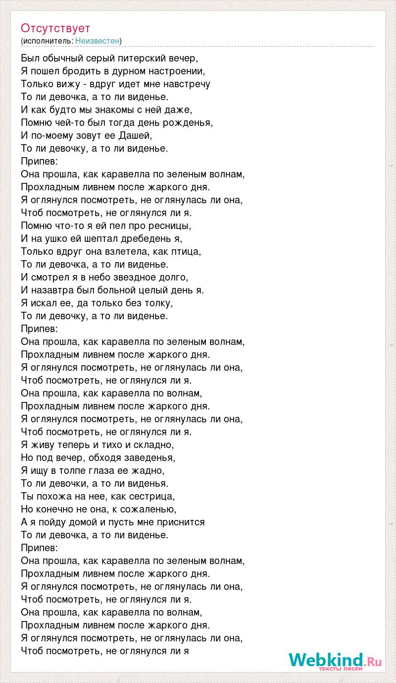 Был обычный серый питерский вечер, Я пошел бродить в дурном настроении, Только вижу - вдруг идет мне навстречу То ли девочка, а то ли виденье. И как будто мы знакомы с ней даже, Помню чей-то был тогда день рожденья, И по-моему зовут ее Дашей, То ли девочку, а то ли виденье. Припев: Она прошла, как каравелла по зеленым волнам, Прохладным ливнем после жаркого дня. Я оглянулся посмотреть, не оглянулась ли она, Чтоб посмотреть, не оглянулся ли я. Помню что-то я ей пел про ресницы, И на ушко ей шептал дребедень я, Только вдруг она взлетела, как птица, То ли девочка, а то ли виденье. И смотрел я в небо звездное долго, И назавтра был больной целый день я. Я искал ее, да только без толку, То ли девочку, а то ли виденье. Припев: Она прошла, как каравелла по зеленым волнам, Прохладным ливнем после жаркого дня. Я оглянулся посмотреть, не оглянулась ли она, Чтоб посмотреть, не оглянулся ли я. Она прошла, как каравелла по волнам, Прохладным ливнем после жаркого дня. Я оглянулся посмотреть, не оглянулась ли она, Чтоб посмотреть, не оглянулся ли я. Я живу теперь и тихо и складно, Но под вечер, обходя заведенья, Я ищу в толпе глаза ее жадно, То ли девочки, а то ли виденья. Ты похожа на нее, как сестрица, Но конечно не она, к сожаленью, А я пойду домой и пусть мне приснится То ли девочка, а то ли виденье. Припев: Она прошла, как каравелла по зеленым волнам, Прохладным ливнем после жаркого дня. Я оглянулся посмотреть, не оглянулась ли она, Чтоб посмотреть, не оглянулся ли я. Она прошла, как каравелла по волнам, Прохладным ливнем после жаркого дня. Я оглянулся посмотреть, не оглянулась ли она, Чтоб посмотреть, не оглянулся ли я