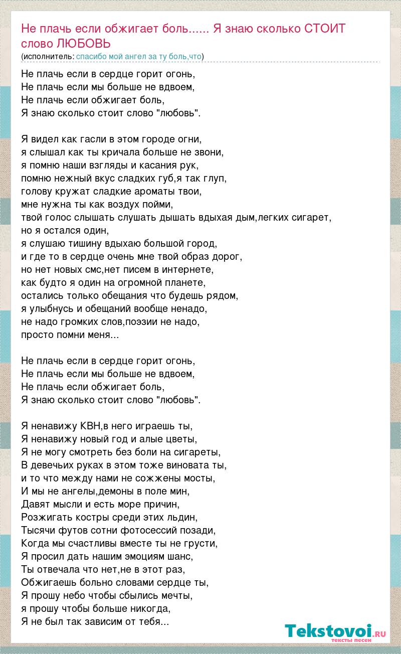 Не плачь если в сердце горит огонь, Не плачь если мы больше не вдвоем, Не плачь если обжигает боль, Я знаю сколько стоит слово "любовь". Я видел как гасли в этом городе огни, я слышал как ты кричала больше не звони, я помню наши взгляды и касания рук, помню нежный вкус сладких губ,я так глуп, голову кружат сладкие ароматы твои, мне нужна ты как воздух пойми, твой голос слышать слушать дышать вдыхая дым,легких сигарет, но я остался один, я слушаю тишину вдыхаю большой город, и где то в сердце очень мне твой образ дорог, но нет новых смс,нет писем в интернете, как будто я один на огромной планете, остались только обещания что будешь рядом, я улыбнусь и обещаний вообще ненадо, не надо громких слов,поэзии не надо, просто помни меня... Не плачь если в сердце горит огонь, Не плачь если мы больше не вдвоем, Не плачь если обжигает боль, Я знаю сколько стоит слово "любовь". Я ненавижу КВН,в него играешь ты, Я ненавижу новый год и алые цветы, Я не могу смотреть без боли на сигареты, В девечьих руках в этом тоже виновата ты, и то что между нами не сожжены мосты, И мы не ангелы,демоны в поле мин, Давят мысли и есть море причин, Розжигать костры среди этих льдин, Тысячи футов сотни фотосессий позади, Когда мы счастливы вместе ты не грусти, Я просил дать нашим эмоциям шанс, Ты отвечала что нет,не в этот раз, Обжигаешь больно словами сердце ты, Я прошу небо чтобы сбылись мечты, я прошу чтобы больше никогда, Я не был так зависим от тебя...