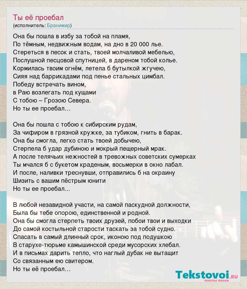 Она бы пошла в избу за тобой на пламя, По тёмным, недвижным водам, на дно в 20 000 лье. Стереться в песок и стать, твоей молчаливой мебелью, Послушной песцовой спутницей, в дареном тобой колье. Кормилась твоим огнём, летела б бутылкой жгучею, Сияя над баррикадами под пенье стальных цимбал. Победу встречать вином, в Раю возлегать под кущами С тобою – Грозою Севера. Но ты ее проебал… Она бы пошла с тобою к сибирским рудам, За чифиром в грязной кружке, за тубиком, гнить в барак. Она бы смогла, легко стать твоей добычею, Стерпела б удар дубиною и мокрый пещерный мрак. А после телячьих нежностей в тревожных советских сумерках Ты мчался б с букетом краденым, восьмерки в окно лабал. И после, наливки треснувши, отправились б на окраину Шизить с вашим пёстрым юнити Но ты ее проебал... В любой незавидной участи, на самой паскудной должности, Была бы тебе опорою, единственной и родной. Она бы смогла стерпеть твоих друзей, побои твои и выходки До самой костыльной старости таскать за тобой судно. Спасать в самый длинный срок, иконою под подушкою В старухе-тюрьме камышинской среди мусорских хлебал. И в письмах дарить тепло, что наглый дубак не вытащит Со связанным ею свитером. Но ты её проебал…