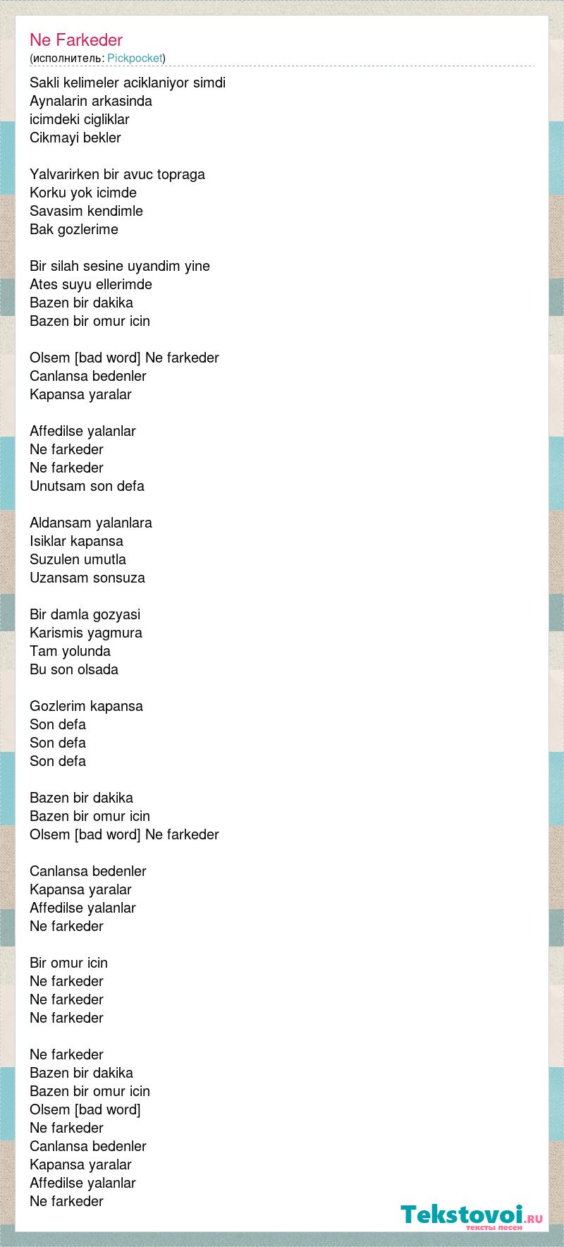 Sakli kelimeler aciklaniyor simdi Aynalarin arkasinda icimdeki cigliklar Cikmayi bekler Yalvarirken bir avuc topraga Korku yok icimde Savasim kendimle Bak gozlerime Bir silah sesine uyandim yine Ates suyu ellerimde Bazen bir dakika Bazen bir omur icin Olsem ugruna Ne farkeder Canlansa bedenler Kapansa yaralar Affedilse yalanlar Ne farkeder Ne farkeder Unutsam son defa Aldansam yalanlara Isiklar kapansa Suzulen umutla Uzansam sonsuza Bir damla gozyasi Karismis yagmura Tam yolunda Bu son olsada Gozlerim kapansa Son defa Son defa Son defa Bazen bir dakika Bazen bir omur icin Olsem ugruna Ne farkeder Canlansa bedenler Kapansa yaralar Affedilse yalanlar Ne farkeder Bir omur icin Ne farkeder Ne farkeder Ne farkeder Ne farkeder Bazen bir dakika Bazen bir omur icin Olsem ugruna Ne farkeder Canlansa bedenler Kapansa yaralar Affedilse yalanlar Ne farkeder