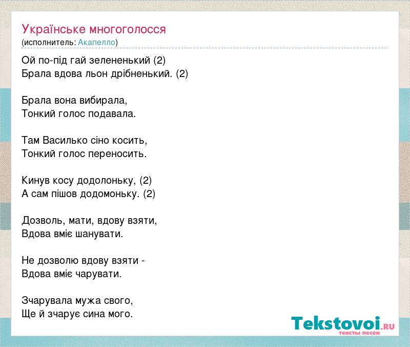 Ой по-під гай зелененький (2) Брала вдова льон дрібненький. (2) Брала вона вибирала, Тонкий голос подавала. Там Василько сіно косить, Тонкий голос переносить. Кинув косу додолоньку, (2) А сам пішов додомоньку. (2) Дозволь, мати, вдову взяти, Вдова вміє шанувати. Не дозволю вдову взяти - Вдова вміє чарувати. Зчарувала мужа свого, Ще й зчарує сина мого.