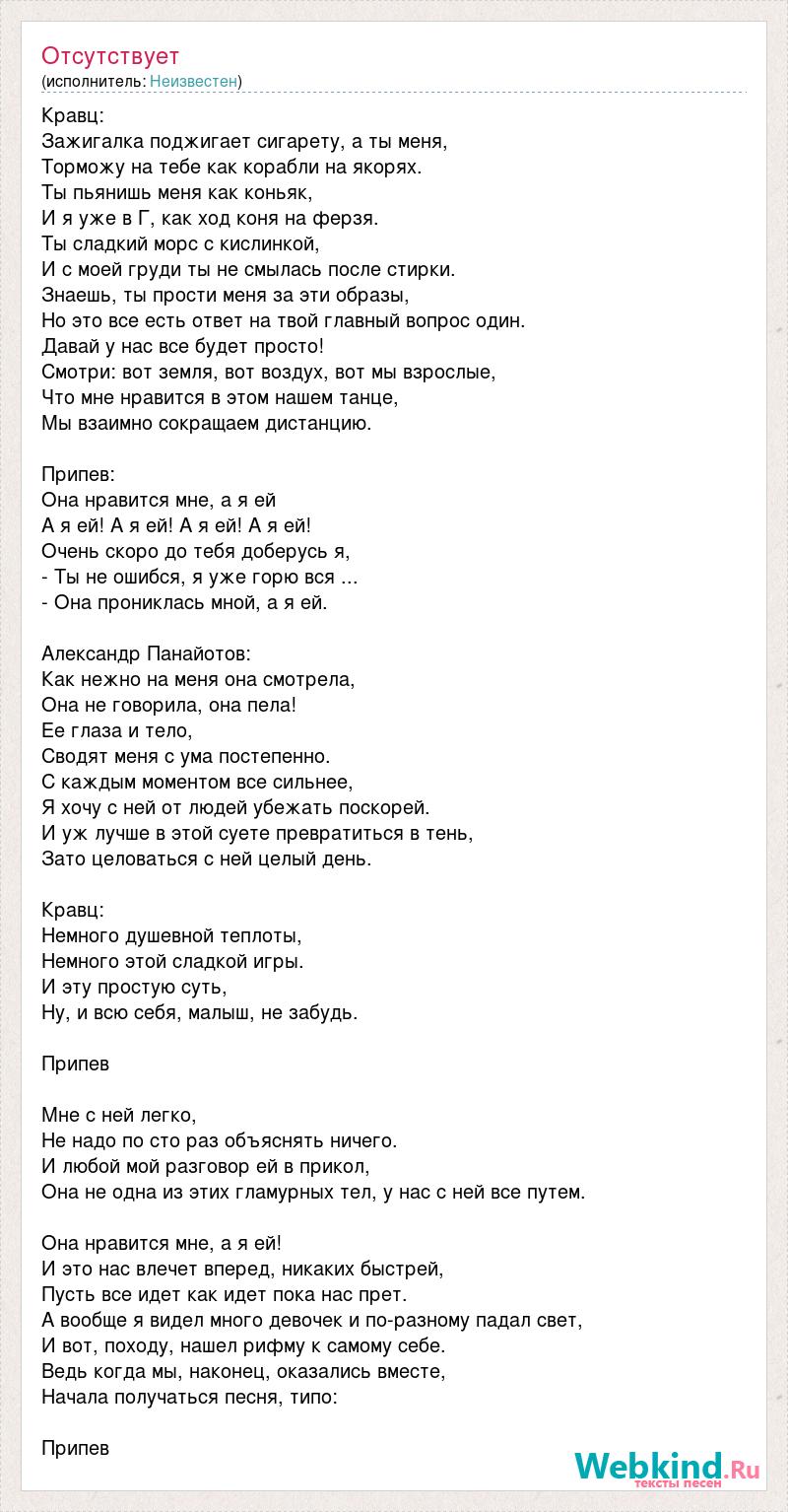 Кравц: Зажигалка поджигает сигарету, а ты меня, Торможу на тебе как корабли на якорях. Ты пьянишь меня как коньяк, И я уже в Г, как ход коня на ферзя. Ты сладкий морс с кислинкой, И с моей груди ты не смылась после стирки. Знаешь, ты прости меня за эти образы, Но это все есть ответ на твой главный вопрос один. Давай у нас все будет просто! Смотри: вот земля, вот воздух, вот мы взрослые, Что мне нравится в этом нашем танце, Мы взаимно сокращаем дистанцию. Припев: Она нравится мне, а я ей А я ей! А я ей! А я ей! А я ей! Очень скоро до тебя доберусь я, - Ты не ошибся, я уже горю вся ... - Она прониклась мной, а я ей. Александр Панайотов: Как нежно на меня она смотрела, Она не говорила, она пела! Ее глаза и тело, Сводят меня с ума постепенно. С каждым моментом все сильнее, Я хочу с ней от людей убежать поскорей. И уж лучше в этой суете превратиться в тень, Зато целоваться с ней целый день. Кравц: Немного душевной теплоты, Немного этой сладкой игры. И эту простую суть, Ну, и всю себя, малыш, не забудь. Припев Мне с ней легко, Не надо по сто раз объяснять ничего. И любой мой разговор ей в прикол, Она не одна из этих гламурных тел, у нас с ней все путем. Она нравится мне, а я ей! И это нас влечет вперед, никаких быстрей, Пусть все идет как идет пока нас прет. А вообще я видел много девочек и по-разному падал свет, И вот, походу, нашел рифму к самому себе. Ведь когда мы, наконец, оказались вместе, Начала получаться песня, типо: Припев