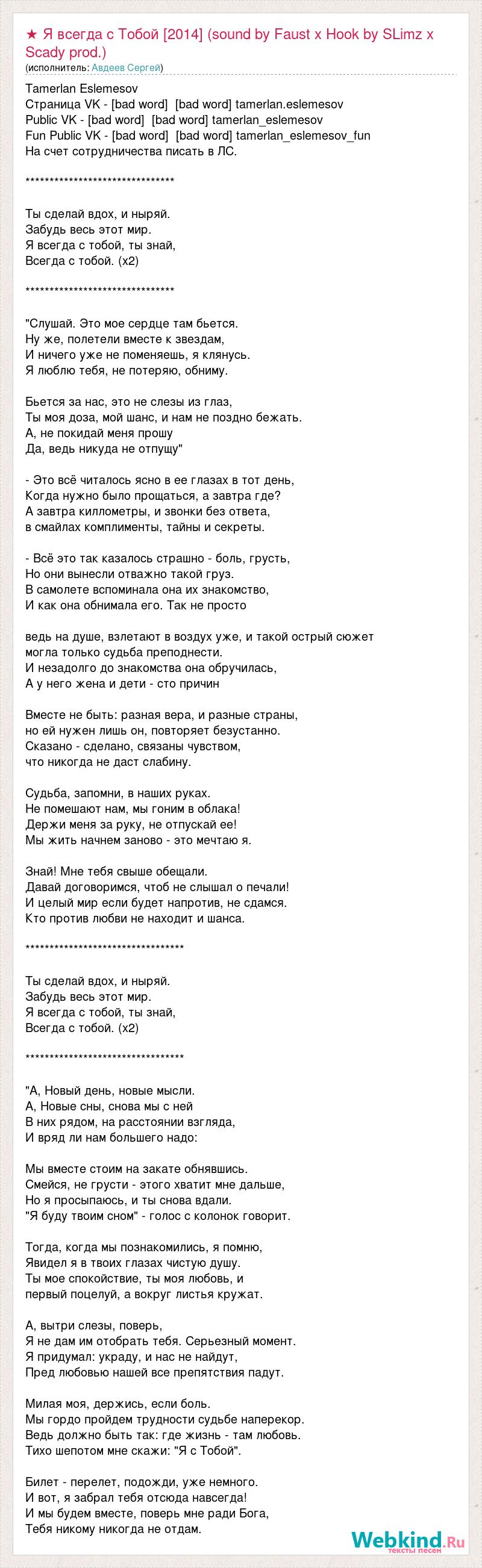 Tamerlan Eslemesov Страница VK - [bad word] [bad word] tamerlan.eslemesov Public VK - [bad word] [bad word] tamerlan_eslemesov Fun Public VK - [bad word] [bad word] tamerlan_eslemesov_fun На счет сотрудничества писать в ЛС. ******************************* Ты сделай вдох, и ныряй. Забудь весь этот мир. Я всегда с тобой, ты знай, Всегда с тобой. (x2) ******************************* "Слушай. Это мое сердце там бьется. Ну же, полетели вместе к звездам, И ничего уже не поменяешь, я клянусь. Я люблю тебя, не потеряю, обниму. Бьется за нас, это не слезы из глаз, Ты моя доза, мой шанс, и нам не поздно бежать. А, не покидай меня прошу Да, ведь никуда не отпущу" - Это всё читалось ясно в ее глазах в тот день, Когда нужно было прощаться, а завтра где? А завтра киллометры, и звонки без ответа, в смайлах комплименты, тайны и секреты. - Всё это так казалось страшно - боль, грусть, Но они вынесли отважно такой груз. В самолете вспоминала она их знакомство, И как она обнимала его. Так не просто ведь на душе, взлетают в воздух уже, и такой острый сюжет могла только судьба преподнести. И незадолго до знакомства она обручилась, А у него жена и дети - сто причин Вместе не быть: разная вера, и разные страны, но ей нужен лишь он, повторяет безустанно. Сказано - сделано, связаны чувством, что никогда не даст слабину. Судьба, запомни, в наших руках. Не помешают нам, мы гоним в облака! Держи меня за руку, не отпускай ее! Мы жить начнем заново - это мечтаю я. Знай! Мне тебя свыше обещали. Давай договоримся, чтоб не слышал о печали! И целый мир если будет напротив, не сдамся. Кто против любви не находит и шанса. ********************************* Ты сделай вдох, и ныряй. Забудь весь этот мир. Я всегда с тобой, ты знай, Всегда с тобой. (x2) ********************************* "А, Новый день, новые мысли. А, Новые сны, снова мы с ней В них рядом, на расстоянии взгляда, И вряд ли нам большего надо: Мы вместе стоим на закате обнявшись. Смейся, не грусти - этого хватит мне дальше, Но я просыпаюсь, и ты снова вдали. "Я буду твоим сном" - голос с колонок говорит. Тогда, когда мы познакомились, я помню, Явидел я в твоих глазах чистую душу. Ты мое спокойствие, ты моя любовь, и первый поцелуй, а вокруг листья кружат. А, вытри слезы, поверь, Я не дам им отобрать тебя. Серьезный момент. Я придумал: украду, и нас не найдут, Пред любовью нашей все препятствия падут. Милая моя, держись, если боль. Мы гордо пройдем трудности судьбе наперекор. Ведь должно быть так: где жизнь - там любовь. Тихо шепотом мне скажи: "Я с Тобой". Билет - перелет, подожди, уже немного. И вот, я забрал тебя отсюда навсегда! И мы будем вместе, поверь мне ради Бога, Тебя никому никогда не отдам.