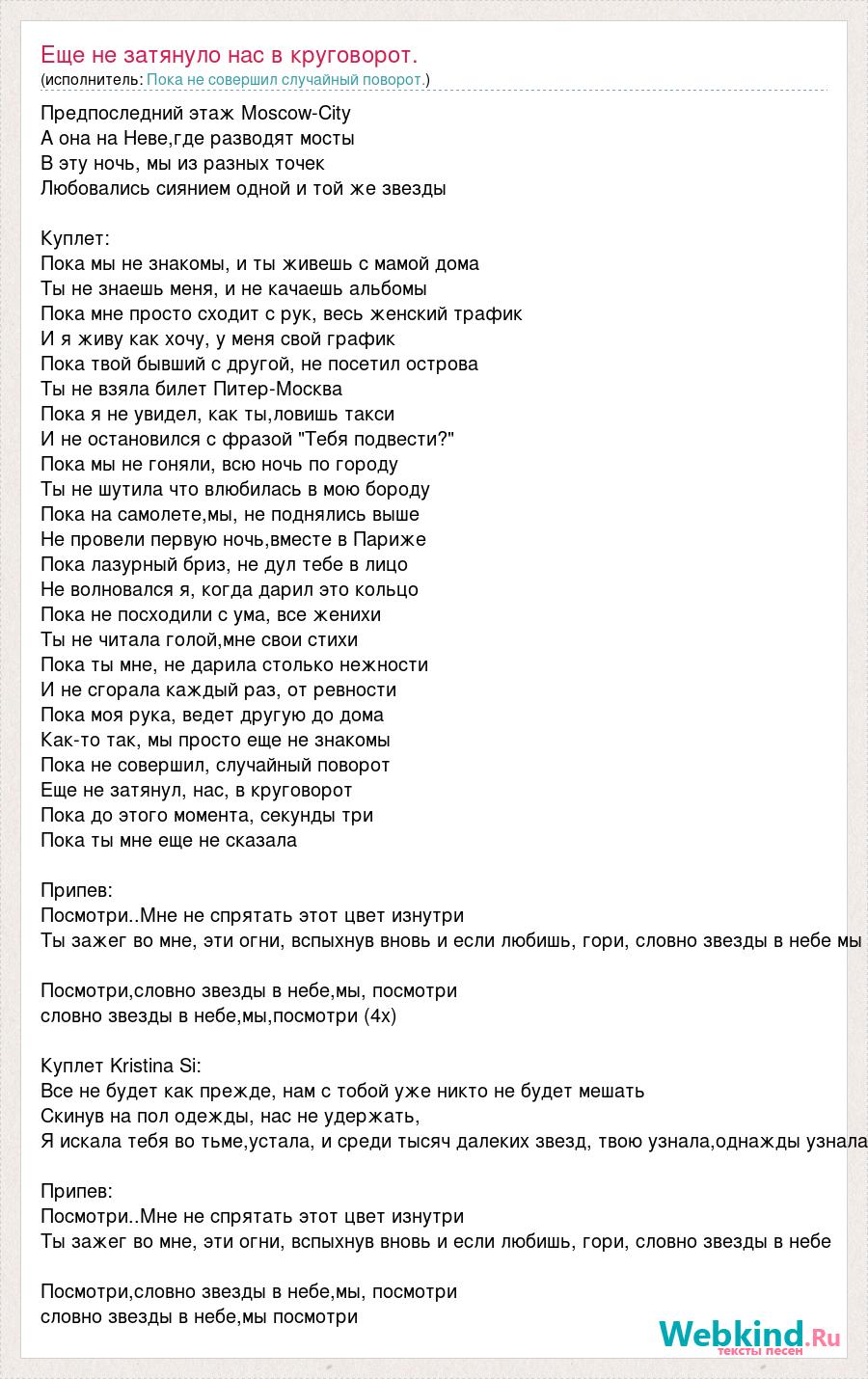 Предпоследний этаж Moscow-City А она на Неве,где разводят мосты В эту ночь, мы из разных точек Любовались сиянием одной и той же звезды Куплет: Пока мы не знакомы, и ты живешь с мамой дома Ты не знаешь меня, и не качаешь альбомы Пока мне просто сходит с рук, весь женский трафик И я живу как хочу, у меня свой график Пока твой бывший с другой, не посетил острова Ты не взяла билет Питер-Москва Пока я не увидел, как ты,ловишь такси И не остановился с фразой "Тебя подвести?" Пока мы не гоняли, всю ночь по городу Ты не шутила что влюбилась в мою бороду Пока на самолете,мы, не поднялись выше Не провели первую ночь,вместе в Париже Пока лазурный бриз, не дул тебе в лицо Не волновался я, когда дарил это кольцо Пока не посходили с ума, все женихи Ты не читала голой,мне свои стихи Пока ты мне, не дарила столько нежности И не сгорала каждый раз, от ревности Пока моя рука, ведет другую до дома Как-то так, мы просто еще не знакомы Пока не совершил, случайный поворот Еще не затянул, нас, в круговорот Пока до этого момента, секунды три Пока ты мне еще не сказала Припев: Посмотри..Мне не спрятать этот цвет изнутри Ты зажег во мне, эти огни, вспыхнув вновь и если любишь, гори, словно звезды в небе мы Посмотри,словно звезды в небе,мы, посмотри словно звезды в небе,мы,посмотри (4х) Куплет Kristina Si: Все не будет как прежде, нам с тобой уже никто не будет мешать Скинув на пол одежды, нас не удержать, Я искала тебя во тьме,устала, и среди тысяч далеких звезд, твою узнала,однажды узнала Припев: Посмотри..Мне не спрятать этот цвет изнутри Ты зажег во мне, эти огни, вспыхнув вновь и если любишь, гори, словно звезды в небе Посмотри,словно звезды в небе,мы, посмотри словно звезды в небе,мы посмотри