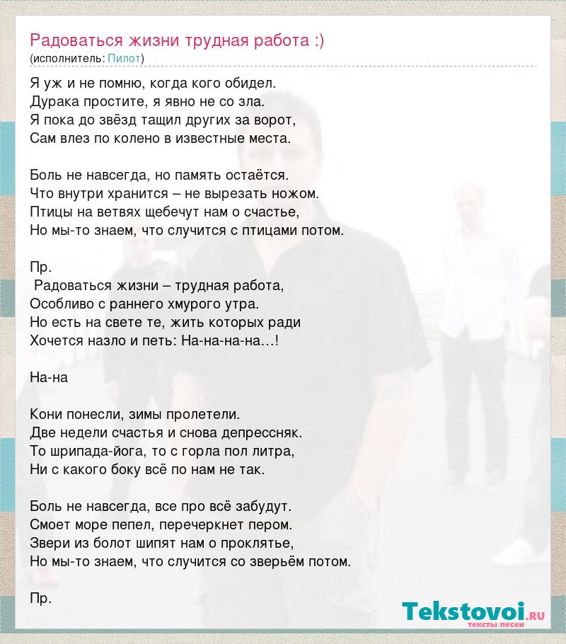 А как ты думаешь, о чем песня "Радоваться жизни трудная работа :)" ?